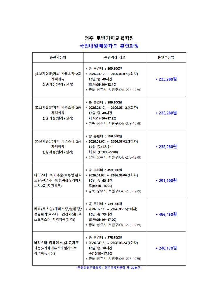 2026년 로빈커피교육학원 개강 안내입니다