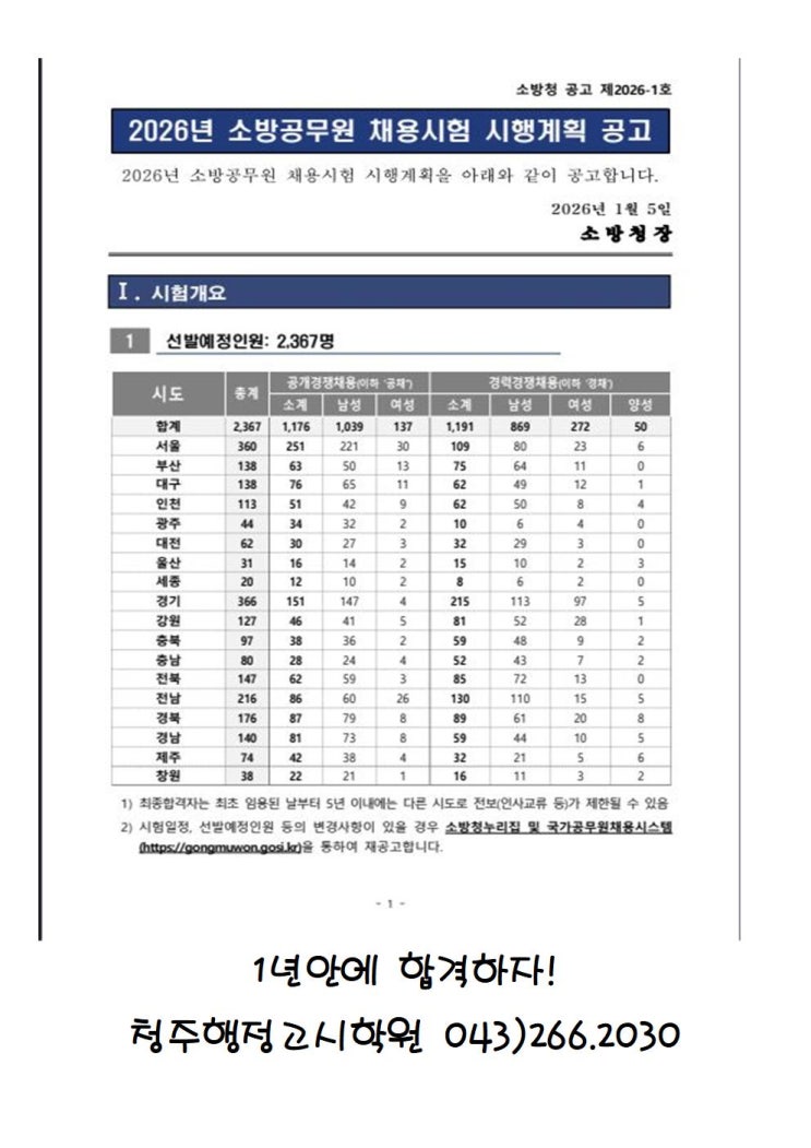 소방청 공고 제2026-1호 2026년 소방공무원 채용시험 시행계획을 아래(붙임)와 같이 공고합니다. 2026년1월5일 소방청장 <img src="https://blogthumb.pstatic.net/MjAyNjAxMDVfMTAy/MDAxNzY3NTc5MTg5MjQx.Czj20oao-qLr6X6od0a5hRGZJXa6f6DIpCQ021GTUaIg.ezyOMKqb_-HLNYirSeptwX_Oc5hrVZ28WthocxdVp2Ug.JPEG/1%B3%E2%BE%C8%BF%A1_%C7%D5%B0%DD%C7%CF%C0%DA001.jpg?type=s3" />