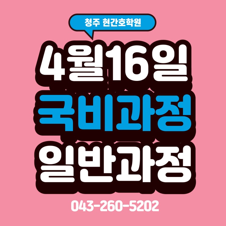 ♥ 청주시 간호학원 중 유일한 노동부 선정 5년 우수훈련기관 ♥ ♥ 노동부 선정 5년 연속 취업률 우수훈련기관 ♥ ------------------------- 안내사항 ------------------------- ♥ 훈련기간 ♥ 2026년 4월 16일 ~ 2027년 2월 18일 (예정) ※개강 일정은 변동 될 수 있음※ ♥ 수업시간 ♥ 평일(월~금) 오전9시 ~ 오후4시 50분 (8교시) 첫 1~3주간 단축 수업 ♥ 이수시간 ♥ 이론 수업 740시간 + 의료기관 실습 780시간 ♥ 정원 ♥ 총 31명(충원 시 마감) ♥ 비용 ♥ 국비생 본인부담금, 총 499,010원~ 874,760원 (분할납부가능, 국민내일배움카드로 결제) ※ 일반으로도 전액부담하여 수강 가능합니다 ※ ♥ 장려금 ♥ 매월 최대 71만6천원(6....... <img src="https://blogthumb.pstatic.net/MjAyNjAyMDJfMjU0/MDAxNzcwMDAwNDQwOTI3.WbLjbpUO8gvEyqPwAHAiv2vBby9aibAtkhqgjvCTRmwg.w4_Kg748cZZIBYp6Tdiv8Qndao-UroWjwPazBEaUOTYg.JPEG/%C1%A6%B8%F1%C0%BB_%C0%D4%B7%C2%C7%D8%C1%D6%BC%BC%BF%E4._%2826%29.jpg?type=s3" />