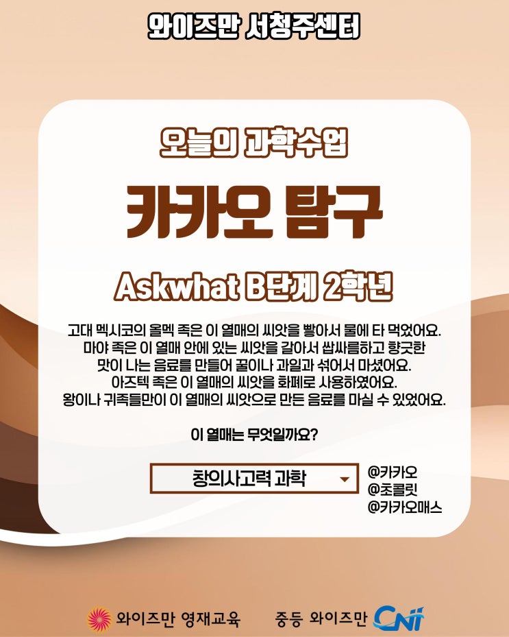 안녕하세요. 와이즈만 서청주센터 입니다. 오늘 소개해 드릴 과학 수업은 2학년 학생들의 달콤 쌉싸름한 초콜릿에 대한 실험 수업입니다. 초콜릿의 주 원료인 카카오 콩을 탐구해 보았는데요? 어떤 흥미로운 수업이었는지 함께 살펴보겠습니다. 오늘의 과학수업 Askwhat B단계 2학년 <카카오 탐구> 고대 멕시코의 올멕 족은 이 열매의 씨앗을 빻아서 물에 타 먹었어요. 마야 족은 이 열매 안에 있는 씨앗을 갈아서 쌉싸름하고 향긋한 맛이 나는 음료를 만들어 꿀이나 과일과 섞어서 마셨어요. 아즈텍 족은 이 열매의 씨앗을 화폐로 사용하였어요. 왕이나 귀족들만이 이 열매의 씨앗으로 만든 음료를 마실 수 있었어요. 이 열매는 무엇일까....... <img src="https://blogthumb.pstatic.net/MjAyNjAzMTJfNDIg/MDAxNzczMjk5NzI4MTU1.92mHDUz3SbegihF2A_ym8GYwNTC5uIuVCPKhX4199oEg.-NJc8wBC3frzQ2V4mDB8OZYOYo8_SB_FJthrBpqUnVUg.JPEG/1.jpg?type=s3" />
