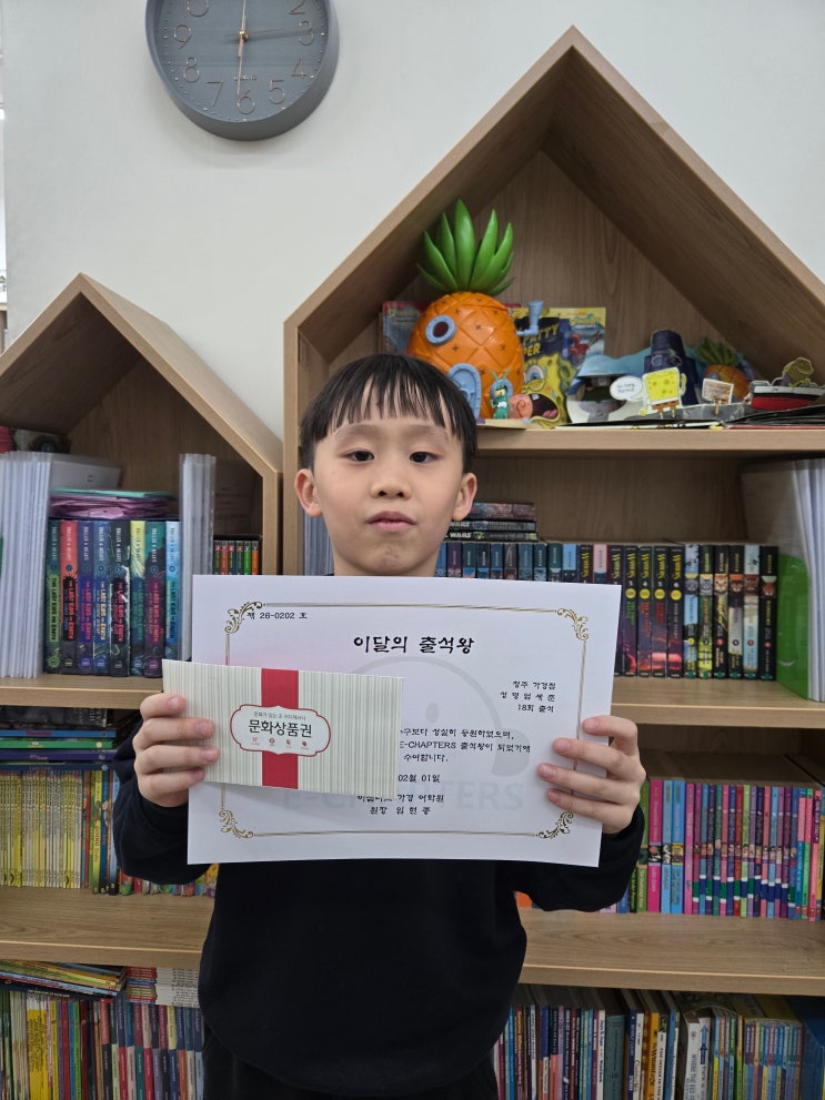 안녕하세요, 이챕터스 가경점입니다 벌써 봄이 다가오는 3월이 찾아왔네요~~ 벚꽃이 활짝 피어서 아름다울거 봄이에요 ! 이제, 지난 한 달 동안 성실하게 출석한 2월의 출석왕을 발표할 시간입니다! 엄세준 학생입니다~! 세준이는 26년도가 되고 난 이후로 길고 난이도 있는책에 굉장히 큰 관심을 보이면서 레벨도 열심히 올리고 있답니다 난이도가 있는 책을 보면서 열심히 하는 모습이 아주 멋있는 세준이에게 출석왕의 축하 박수 보내요 ✨ 이챕터스 친구들도 다음 달 출석왕에 도전해볼까요? 이챕터스 친구들도 함께~ 2월의 출석왕 세준 학생을 다 같이 축하해주세요! <img src="https://blogthumb.pstatic.net/MjAyNjAzMTdfOTQg/MDAxNzczNzI1NDM3NDI2.BIIgDiwUknudJGfnHnwE5azM2_AoHT5wuVuNT2DC5gwg.J0FA--cWogUHdmhhSAW91mFYko1zDm8mowNz93TSgEMg.JPEG/26%B3%E23%BF%F9_%BE%F6%BC%BC%C1%D8.jpg?type=s3" />