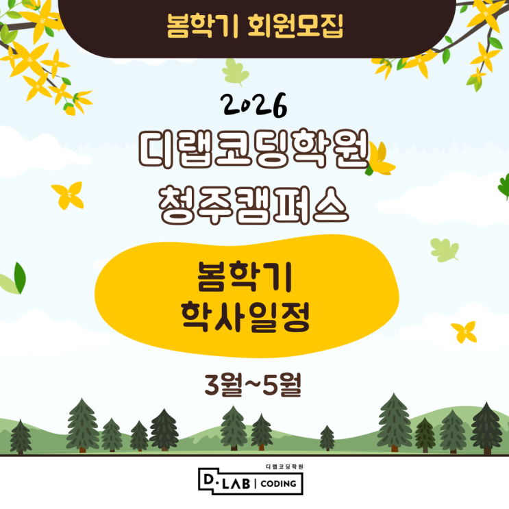 안녕하세요! 코딩교육 전문기관 디랩코딩학원 청주캠퍼스입니다! 2026년 3월! 새로운 봄학기를 맞이하며 3월~5월 봄학기학사일정을 안내합니다! 봄학기 학사일정 3/3(수) ~ 5.19(화) 봄학기 학사 일정에 따라 수업이 진행됩니다! 봄학기 평일, 주말 시간표는 2월 중 다시 공지드리겠습니다. 봄학기 회원을 모집중이니 커리큘럼 및 궁금하신 점이 있다면 편하게 문의주세요^^ 전화 문의 043-222-2565 카카오톡 문의 2026년 봄학기 개강을 맞이하여 설명회&체험수업이 실시됩니다. 우리 아이의 AI경쟁력을 디랩과 함께 준비하세요! ▼자세한 내용은? 클릭▼ 디랩의 체계적인 커리큘럼으로 아이의 미래를 바꿔주세요! 자세한 커리큘럼은? ▼▼▼ <img src="https://blogthumb.pstatic.net/MjAyNjAyMTBfNjgg/MDAxNzcwNjg3OTk1NjQx.4QNktQDxJBnIJ-z_ZUpuLgZyAKexqurAFQesvO_WSFUg.JAYKCasSiVlAghMdKDe16yjNhtxDI3wRt-CsLVkNnQYg.PNG/%B5%F0%B7%A6%BA%ED%B7%CE%B1%D7-%C7%D0%B1%E2%BA%B0-%BE%C8%B3%BB-006.png?type=s3" />