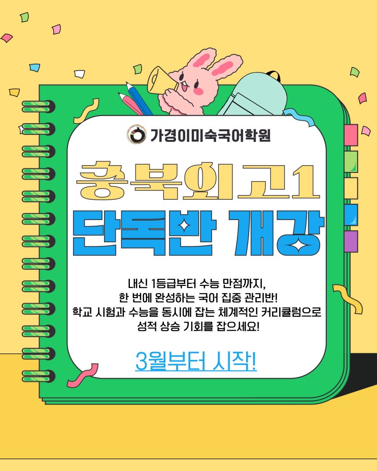 2026년 1학기 3월 개강! 가경이미숙국어학원 충북외고1 단독반 개강 확정 2026년 1학기, 국어 1등급을 향한 가장 확실한 선택! 가경이미숙국어학원에서 ‘충북외고1 단독반’을 개강합니다. ✨ 국어, 왜 단독반이어야 할까요? 2026년 1학기, 가경이미숙국어학원에서는 학교별 맞춤형 단독반을 운영합니다. 단순한 인원 분리가 아닙니다. 학교별 진도와 시험 범위에 맞춘 꼼꼼한 내신 수업을 위해서입니다. 1️⃣ 학교별 맞춤 내신 수업 학교마다 ✔ 시험 범위 ✔ 출제 스타일 ✔ 서술형 유형 ✔ 중요하게 다루는 작품과 핵심 개념이 모두가 다릅니다. 단독반은 해당 학교의 시험 범위와 출제 경향에 맞춰 수업을 진행합니다....... <img src="https://blogthumb.pstatic.net/MjAyNjAyMTlfMjc3/MDAxNzcxNDk2NjMyNjIx.oO3ro7GoVu2NYrXUZFFzpdadtmLAzU76ph3AE-FKquwg.UE3KwWHIwsGfOGuZInoo9FZXRNEs0FZzw6SdBP771aQg.JPEG/%C3%E6%BA%CF%BF%DC%B0%ED1_%B4%DC%B5%B6%B9%DD.jpg?type=s3" />