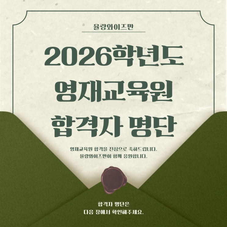 안녕하세요. 율량와이즈만입니다. 2026학년도 영재교육원 선발 결과가 발표되어 기쁜 소식을 전해드립니다. 그동안 묵묵히 노력해 온 학생들의 시간이 좋은 결실로 이어져, 이번 영재교육원 선발에서도 좋은 결과를 얻을 수 있었습니다. 아래에서 2026학년도 영재교육원 합격자 명단을 확인해보세요. ※현재 명단 취합중에 있습니다※ 명단에 누락된 학생이나 추가 합격한 학생의 경우, 율량와이즈만 센터로 연락 부탁드립니다. 이번 2026학년도 영재교육원 합격자들은 충북자연과학연구원 영재교육원, 청주교육대학교 영재교육원, 충북대학교 영재교육원 등 여러 기관에 합격하였습니다. 율량와이즈만에서는 학생 개개인의 수준에 맞춘 맞춤 학....... <img src="https://blogthumb.pstatic.net/MjAyNjAxMDJfNjEg/MDAxNzY3MzU1NTc1MDMz.ruqADe5hgpWYyhIDQvfGBBeeIaS-fei6zBLkh36yIPog.SLTZgScvp0gTxTRfSy0cvgKZYIzWLyvZqgDFgFTDdhUg.PNG/%B8%ED%BF%B9%C0%C7%C0%FC%B4%E7_%BF%B5%C0%E7%BF%F8_26_-001.png?type=s3" />