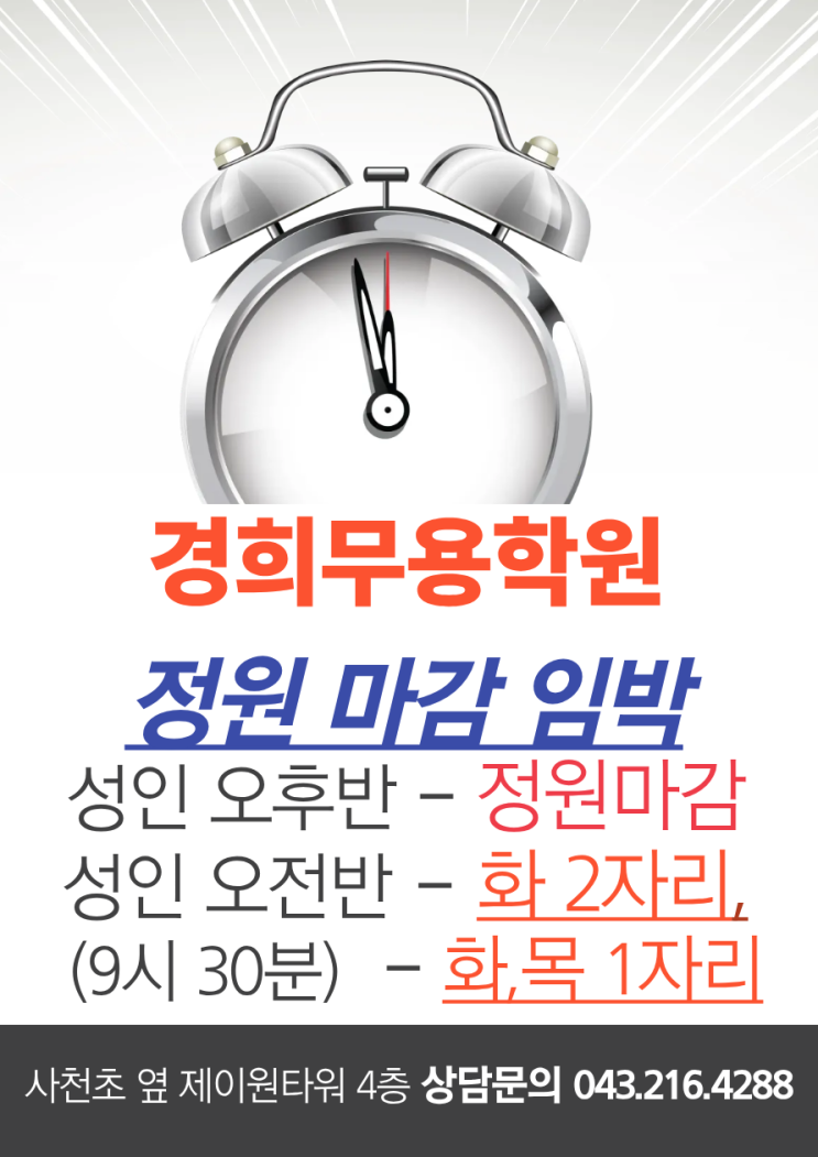 지금 문의가 급증하면서 ✨성인발레 클래스 잔여자리 얼마 남지 않았습니다✨ ✔️ “조금 더 고민해볼까…” 하는 사이 인기 시간대는 이미 마감 직전입니다. 경희무용학원은 ✔️ 소수 정원으로 더 꼼꼼한 지도 ✔️ 초보자도 부담 없이 시작 가능한 커리큘럼 ✔️ 체형교정 + 라인 변화 확실한 수업 으로 운영되어 빠르게 마감되고 있어요 특히 직장인 저녁반 / 인기 시간대는 정원마감으로 대기 신청 받고 있습니다. 오전반 지금 바로 신청하셔야 합니다. 망설이다 놓치면 다음 오픈까지 기다리셔야 해요 ✨ “언젠가 해야지” → ❌ ✨ “지금 시작할 때” → ⭕ 지금이 가장 빠른 타이밍입니다 문의 주시면 남은....... <img src="https://blogthumb.pstatic.net/MjAyNjAzMThfMTk4/MDAxNzczODI3NzIwMTE4.HGqX4EIgNBvN5ogBBhleRJZUVHj7xXlMiNZ2uP_6nFYg.X2CZaWiMAkWctlMzBq9s015k9kEWnmg9LXzvmNvqH7Ig.PNG/%C1%A6%B8%F1%C0%BB_%C0%D4%B7%C2%C7%D8%C1%D6%BC%BC%BF%E4._%284%29.png?type=s3" />