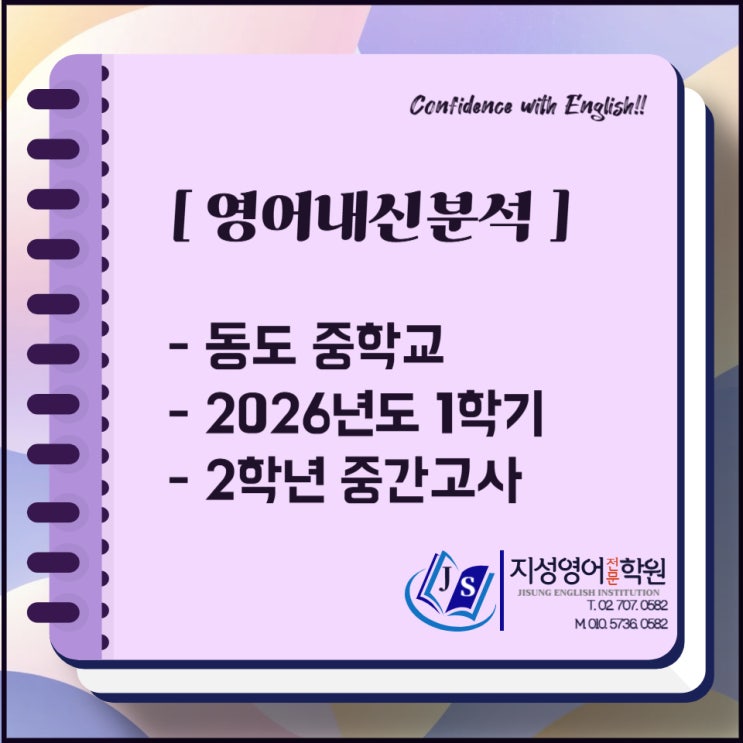 여러분~ 안녕하세요? 오늘은 동도중학교 2학년 학생들이 26학년도 1학기 중간고사를 치렀습니다. 각종 변형문제에 대비해 철저히 시험 준비한 덕분에 우리 지성학원 동도중학교 학생들은 기본에 충실한 이번 중간고사 문제들이 평소보다 쉽게 느껴졌다고 하며 좋은 성적을 거뒀습니다. 대견해요!!^^ 시험 범위는 1-2과, 전 문항 객관식 28문항, 100점 만점입니다. 올해에도 작년에 이어 어법 비중이 가장 높았고, 뒤를 이어 빈칸추론, 영영풀이 어휘 출제 비중이 높았습니다. 핵심 어법에서는 두 문장을 한 문장으로 전환하는 간접의문문이 출제 되었습니다. 직접의문문이 문장 안으로 들어가는 간접의문문은 어순이 [의문사+주어+동사] 다들 기....... <img src="https://blogthumb.pstatic.net/MjAyNjA0MjRfMTkz/MDAxNzc3MDI0MTA0MTUw.-JdAOuP7dzcCnVd08lhnj_TYIeiDvjfIe52faAq-cpcg.L9S7hHZrxBh_WVvwutwExtmUuxWKaIZn1kXtUcXHVngg.JPEG/%B3%BB%BD%C5%BD%C3%C7%E8_%BD%E6%B3%D7%C0%CF_%28%C1%DF%C7%D0%BF%B5%BE%EE%29_26%B3%E2_1%C7%D0%B1%E2_%C1%DF%B0%A3-001.jpg?type=s3" />