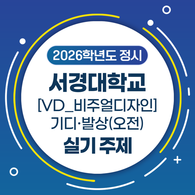 2026학년도 정시 서경대학교 VD_비주얼디자인 기초디자인&발상과표현 오전 실기주제 안녕하세요! 홍대 창조의아침입니다. 서경대학교 VD비주얼디자인학과의 오전 실기고사가 1월 10일인 오늘 오후 1시에 종료되었습니다! 주제어와 함께 출제되는 서경대학교 실기고사! 이번에는 과연 어떤 주제가 출제되었을까요? 홍대 창아와 함께 확인해 보도록 하겠습니다~ 2026학년도 서경대학교 정시모집 [VD_비주얼디자인] 기초디자인 오전 실기고사 제시된 이미지를 활용하여 탄성과 반사를 표현하시오. 2026학년도 서경대학교 정시모집 [VD_비주얼디자인] 발상과표현 오전 실기고사 제시된 이미지를 활용하여 우주 전쟁을 표현하시오. 2026학년도 정....... <img src="https://blogthumb.pstatic.net/MjAyNjAxMTBfMjQg/MDAxNzY4MDIxNDg0NjY1.V35V-juaXvn0M4xd5SE9B18NruAo9Rh2EjsZRuxZircg.LKy0lUCFiEkXixxzGkhc0VyN9lDtd6M1qtx7VxgkBbgg.PNG/%BD%BD%B6%F3%C0%CC%B5%E52.PNG?type=s3" />