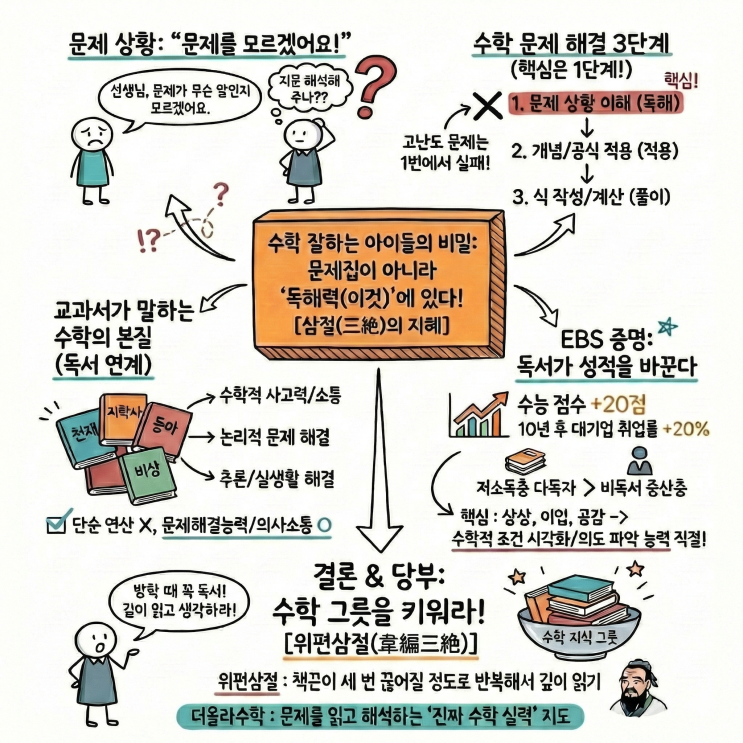 삼절(三絶) 안녕하세요. 마포 더올라수학 진혜원T입니다. 저는 수학을 가르칩니다. 하지만 수업 시간 아이들과 씨름하다 보면, 수학을 가르치는 것만큼 지문을 해석해주고 있습니다. 학생들이 문제를 풀며 많이 하는 질문은 "선생님, 무슨 말인지 모르겠어요." 제가 수업을 준비하면서도 드는 걱정은 '이 문제는 아이들이 무슨 말인지 모를 것 같다.' 고난도의 기준 칠판 한 가득 문제를 풀고난 후 아이들에게 다시 한 번 정리해줄 때면 문제를 읽고 식을 작성하고 나면 나머지는 계산입니다. 문제의 상황을 읽고 이해한다. (이해) 2. 필요한 개념과 공식을 적용한다. (적용) 3. 식을 작성하고 계산한다. (풀이) 수학을 어려....... <img src="https://blogthumb.pstatic.net/MjAyNjAxMTBfMzIg/MDAxNzY4MDUxMTAzMjEy.0TDaQrFxZgmvbQVYrXo1_8lylQ4psDXGC1K0AEwAtcYg.0LV_dATmpszBmkoycyiBSVL7di7XSYTfH5bxR9XML-Ug.PNG/260110_7%B9%F8.png?type=s3" />