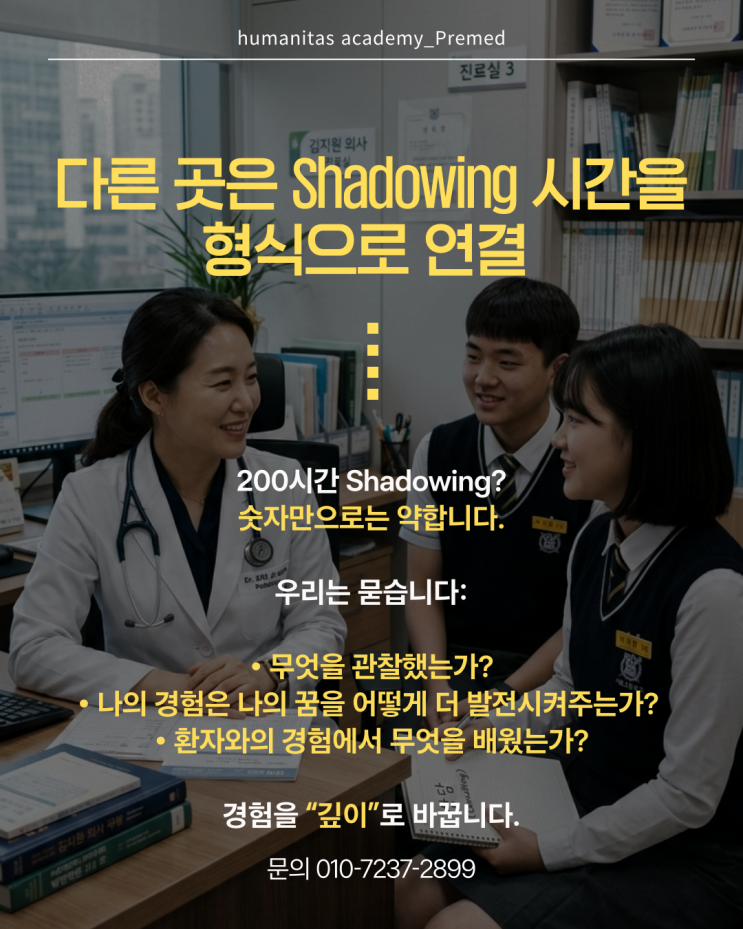 안녕하세요. 합격자의 1%를 만드는 힘. 후마니타스아카데미 입니다. 미국치의대유학을 준비하는 학생들이 가장 많이 어려워하죠 !! 지원 조건과 준비 순서를 정리해볼까요. 스펙을 그냥 쌓는 방식으로 미국 치 대의 대 입학을 할 수 있을까요? 그저 공부만 한다고? 엇을 먼저 해결해야 하고 어떤 방식으로 하는지 실전 노하우 중심으로 말씀드리게요. 미국치의대유학, 조건을 대충 맞춘다 합격 노노 !! GPA 그냥 기본입니다. shadowing 이 뭔지는 아시나요? 그냥 시간만 채우기 노노!! 학업 능력, 에세이, 실제 의료 현장에서의 생생한 경험, 인터뷰가 자연스럽게 학생만의 것으로 녹아들어 갔을때, 합격을 결정하시는 교수님이 이 학생은 준비가....... <img src="https://blogthumb.pstatic.net/MjAyNjAzMTZfMjAz/MDAxNzczNjU2MDYxNjE3.9NbQ3a10AGCUMry_wkcGgtpGmoIEYDHa1wmApF2-WXEg.DLBmZMpNGwvyFo_Q4A2FTrt_eHcM_Dmn9lsm9qeZVJwg.PNG/image.png?type=s3" />