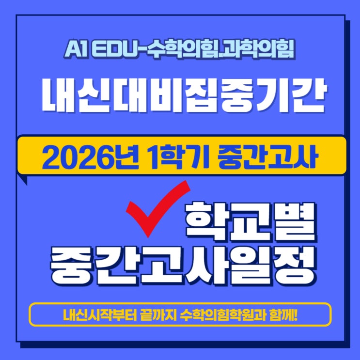 마음에 기술을 더하다! 안녕하세요. A1 EDU-수학의힘.과학의힘입니다. 새 학기의 설렘이 가득했던 3월도 어느덧 하순으로 접어들고 있습니다. 우리 아이들에게는 첫 단추를 꿰는 중요한 시험인 1학기 중간고사 가 다가오고 있는데요. 일정을 미리 확인하고 빠르게 전략을 세우는 것이 성장의 시작이겠지요? 오늘은, 수학의힘 학원에서 우리 지역 주요 학교들의 중간고사 일정을 정리해드립니다! 수학의힘.과학의힘 학원에서는 내신 과목별 학습계획과 주차별 학습전략을 함께 세워나가며 효과적이고, 효율적인 내신대비를 통해 반드시 성적이 오르도록 끝까지 최선을 다하겠습니다! <img src="https://blogthumb.pstatic.net/MjAyNjAzMjFfMTgy/MDAxNzc0MDkyMTEyNDk5.7xHe55geTDBL3LGUadAFr9Aum7C22k3_vj_2DW-0pTUg.Uu1XXhcZIU7evZq4LqUqEV4x91rRUyLxiO9C-UZ9E0Mg.JPEG/%C1%A6%B8%F1%C0%BB_%C0%D4%B7%C2%C7%D8%C1%D6%BC%BC%BF%E4_-001_%2821%29.jpg?type=s3" />