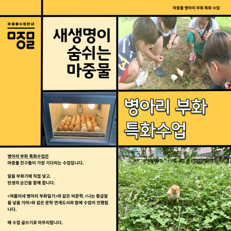 안녕하세요, 학부모님들 :) 2026년 병아리 부화 수업이 4월부터 시작됩니다. 생명의 온도를 만나는 시간, 병아리 부화 수업 사랑이라는 감정은 어디에서 시작될까요? 부화 과정에 대한 단순한 호기심과 병아리의 귀여움에서 출발해 기다림과 돌봄을 거치며 진짜 감정으로 자라납니다. 마중물 학원의 병아리 부화 수업은 아이들이 몸과 마음으로 직접 경험하는 특별한 과정입니다. 생명을 통해 배우는 사랑과 책임 책이나 말로만 가르칠 수 없는 감정, 바로 사랑과 책임감은 생명을 돌보는 경험 속에서 자연스럽게 싹틉니다. 병아리 부화를 위해서는 37.5도를 유지해야 합니다. 아이들은 이렇게 21일 동안 알을 품고 기다린 끝에 태어난....... <img src="https://blogthumb.pstatic.net/MjAyNjAzMjJfMTA4/MDAxNzc0MTUyMTI5NDI5.t3Dz_kP-9Fy1jFoOG1CCYbBFsr6FLIS3kHkjHFsyZl8g.gjKQdmYPUeTHB-uYTEaLeozMzSXcZV9ny-qp6tYl3dog.PNG/KakaoTalk_20260322_123810931.png?type=s3" />