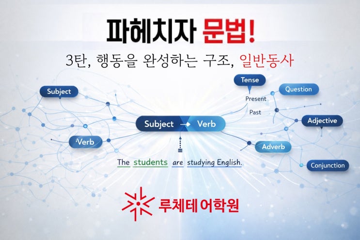 행동을 완성하는 구조, 일반동사 안녕하세요. 루체테어학원 마포상암캠퍼스입니다. 1탄에서 주어와 동사로 문장의 뼈대를 세웠다면, 2탄에서 be동사로 상태를 세웠습니다. 이제 문장은 본격적으로 움직입니다. 그 중심에 있는 것이 일반동사입니다. 일반동사는 무엇일까요? 많은 아이들이 일반동사는 행동을 나타내는 말이라고 배웁니다. 틀린 설명은 아닙니다. 하지만 그것만으로는 부족합니다. 일반동사는 주어가 무엇을 하는지를 완성하는 구조입니다. 예를 들어보겠습니다. I play soccer. She reads a book. They study English. 겉으로 보면 단순한 문장입니다. 하지만 이 안에는 일반동사의 핵심 구조가 모두 들어 있습니다. 먼저 주....... <img src="https://blogthumb.pstatic.net/MjAyNjAzMDNfNTMg/MDAxNzcyNDY0ODE4ODQ3.MnQsr-e_Un-qp5rO_iruCcwv-PLvt9sUc2Tz8ryDtvog.2LoU56Y4iySQvnXLhc0RaEWpCOnyAUA18mo6zzoduwIg.JPEG/%C0%CF%B9%DD%B5%BF%BB%E7.jpg?type=s3" />
