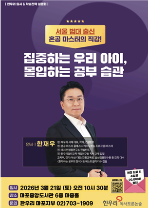 안녕하세요! 한우리 독서토론논술 마포지부입니다. 새 학기가 시작되고 벌써 한 주가 지나갔습니다. 우리 아이들 공부습관 고민 많으시죠? 책상 앞에 앉아는 있는데 공부는 하는건지 잠깐 앉아있더니 금새 스마트폰의 안부를 묻고 있는 우리 아이들 이런 답답함을 느끼셨다면 이번 설명회가 고민을 덜어줄겁니다. 3월21일(토) 오전 10시30분 마포중앙도서관 6층 마중홀 혼자하는 공부의 정석 베스트셀러 저자이자 공부법 전문가이신 한재우 강사님을 모시고 우리 아이의 인생을 바꿀 "몰입의 힘"에 대해 심도 있게 파헤쳐 봅니다. 설명회의 네개의 강연포인트를 소개합니다. 왜 우리 아이는 공부를 힘들게 할까요? 공부가 힘든 진짜 이....... <img src="https://blogthumb.pstatic.net/MjAyNjAzMDlfOCAg/MDAxNzczMDQ4NTExNTk2.XzsWEvU8hzbHx0cx4zuSobWszZcCGqqmc-VIwtSMfvkg.7w9K70hC6GkHI-hQ_33CBoz_FJm-6wNTumIu7PyByFgg.PNG/%B1%D7%B8%B21.png?type=s3" />