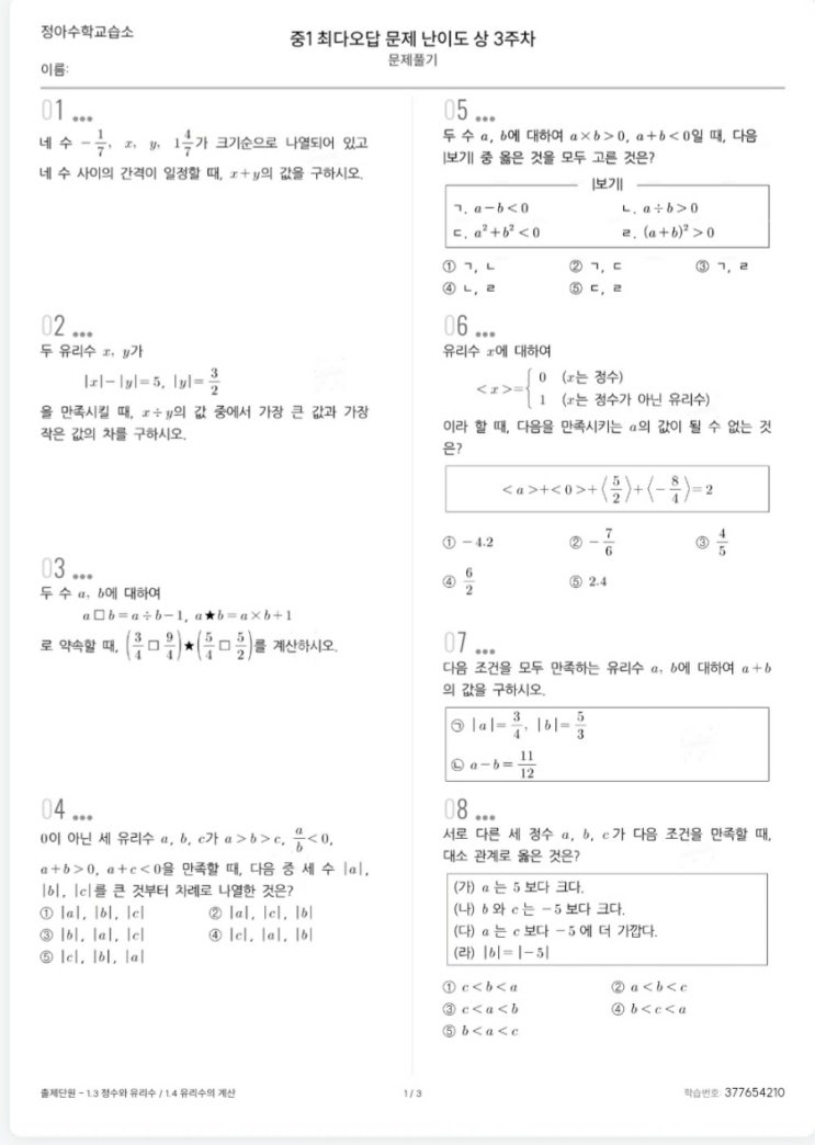 중1 최다오답 문제 난이도 상 3주차