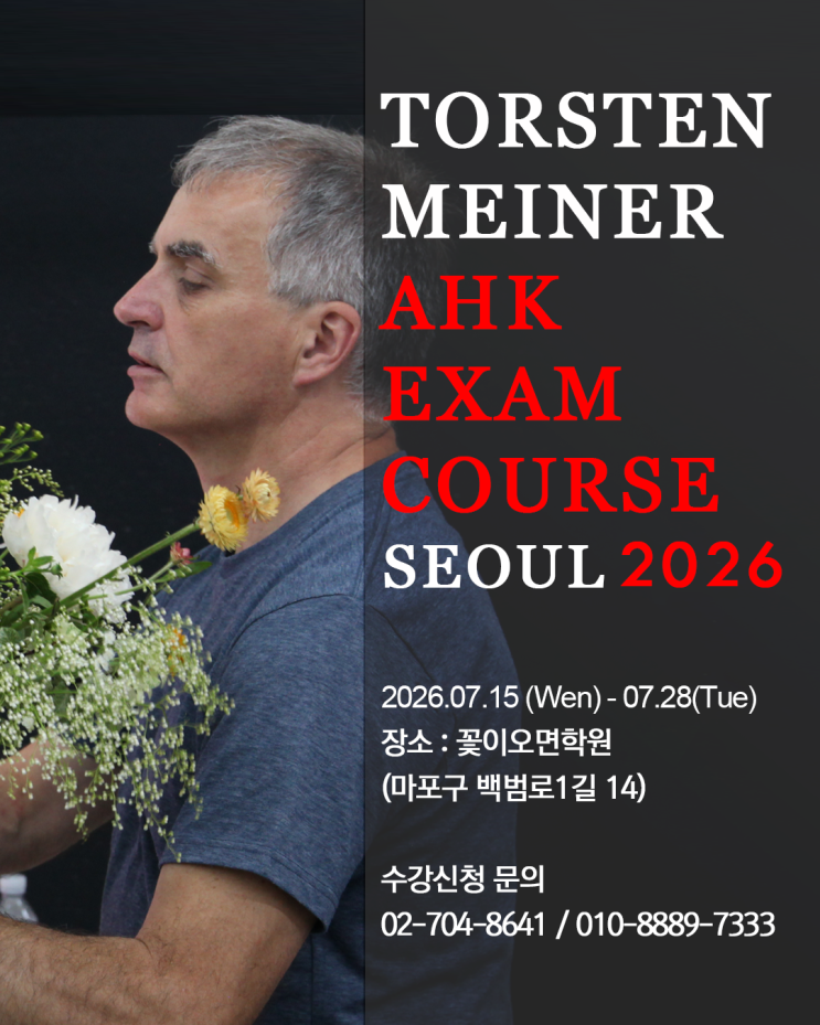 2026년 7월 15일 꽃이오면학원에서 AHK 플로리스트 자격시험을 위한 AHK EXAM COURSE 세미나가 시작 됩니다. 꽃이오면학원은 주한독일상공회의소의 Florist 직업교육 지정기관으로, 주한독일상공회의소로부터 교육 자격을 인정받은 본원 교강사에게 일정 시간의 직업교육을 이수한 수강생분들에 한하여 AHK Florist / Floristin 자격 시험을 응시하는 자격이 주어집니다. 이번에 진행되는 AHK 플로리스트 자격시험을 위한 세미나는 7월 15일 ~ 7월 28일 기간동인 진행되며 그 동안 꽃이오면 학원과 오랜기간 함께 하신 실력있고 유능한 플로리스트이신 Torsten Meiner 선생님의 수업으로 진행 됩니다. 본 세미나 및 AHK 플로리스트 자격교육에 관....... <img src="https://blogthumb.pstatic.net/MjAyNjAzMjFfMzAg/MDAxNzc0MDc3Mjc3MjEw.G58uUnxOitMDcsSNW4JDfTl3VAkDDqk3vOMgiRdVMJsg.h4lmv8jqO5zELyYKdDpy3whygf2238BI2_V3X49c49Eg.PNG/2026_AHK%BC%BC%B9%CC%B3%AA_%C8%AB%BA%B8%B9%B0.png?type=s3" />