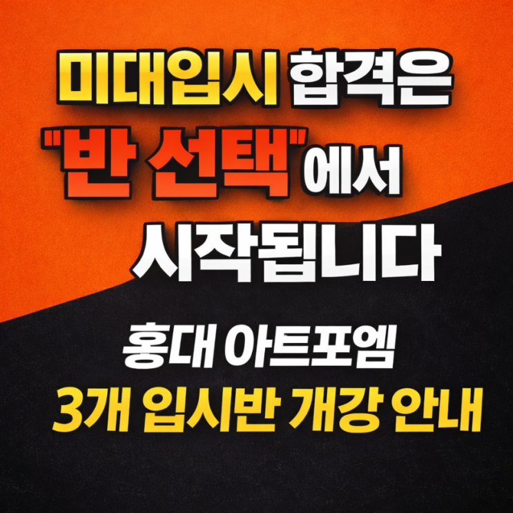 미대입시, 그림만 잘 그리면 되는 걸까요? 미대입시를 준비하는 학생들과 상담을 하다 보면 가장 많이 듣는 질문이 있습니다. "저는 어느 학교를 지원할 수 있을까요?" 하지만 홍대 아트포엠에서는 이 질문을 조금 다르게 생각합니다. “어디를 지원할 수 있느냐”보다 “어디를 지원하는 것이 더 유리하냐” 이 질문에 대한 답을 찾는 것이 미대입시 전략의 시작입니다. 그래서 홍대 아트포엠 미술학원은 학생들의 목표와 성향에 맞춰 3개의 입시반을 운영합니다. 그리고 이 세 개의 반이 2027 미대입시를 준비하는 입시반으로 3월 1일 개강했습니다. 홍대 아트포엠 입시반 구성 홍대 아트포엠 입시반은 단순히 그림 수업만 하는 반이....... <img src="https://blogthumb.pstatic.net/MjAyNjAzMTFfMjgx/MDAxNzczMjMyMDU0MjAy.KN30dTSU9I9qlPl32fEqCb25n5MhaoIbcRB20oVVsFwg.tS_c16_DdSD9tqgrFtG-6G_eePFfcsZ6qP-UjSzR0y4g.PNG/900%A3%DF163a5f54%A3%AD5998%A3%AD4cde%A3%ADafe4%A3%AD418b31e8c2d0.png?type=s3" />