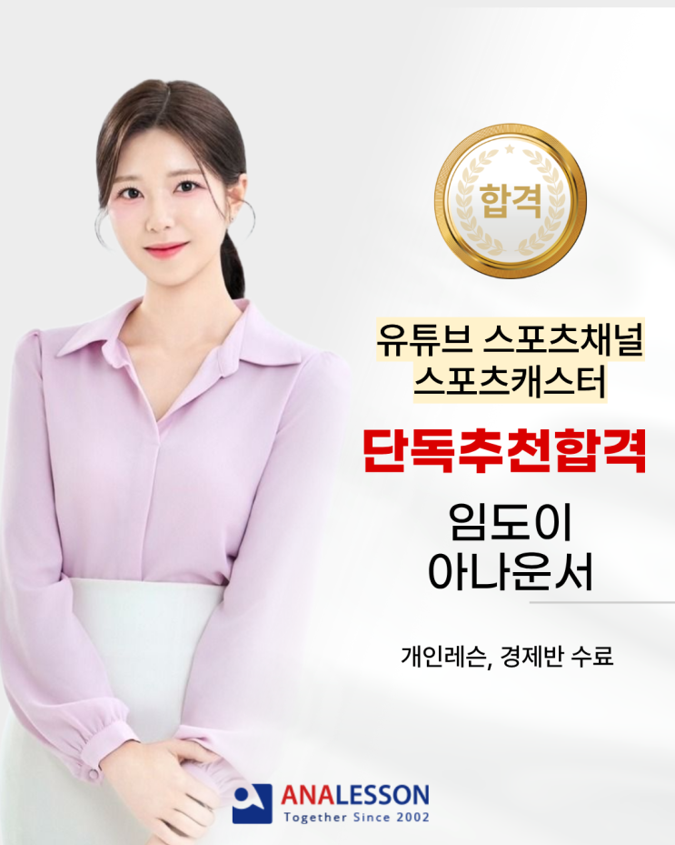여러분, 아나레슨의 기분 좋은 합격 릴레이가 멈출 줄 모릅니다! :) 이번에는 임도이 아나운서가 아나레슨의 단독 추천으로 유튜브 스포츠채널 스포츠캐스터로 합격했다는 소식이에요! 평소 스포츠를 정말 사랑했던 도이 아나운서였기에, 이번 합격 소식이 더욱 특별하고 기쁘게 다가오네요. "도이 말대로 드디어 '덕업일치'가 되었네! 좋아하는 일을 향한 너의 열정을 응원해!" 좋아하는 마음이 담긴 생생한 중계로 많은 스포츠 팬의 마음을 사로잡으리라 믿어 의심치 않습니다. ♥ 중계석에서 더욱 밝게 빛날 임도이 스포츠캐스터의 활약을 아나레슨이 온 마음 다해 응원할게요! <img src="https://blogthumb.pstatic.net/MjAyNjAzMDlfOTYg/MDAxNzczMDIzNzY3MDM2.xtpJNPnKqxCNTdKonih4W3pigW6U7pF7GXbJFKqxnygg.2BulN-cXZWdKKoBT1Xh0XptwAeQXOSy3mASu2Ma3ra4g.PNG/13-%C0%D3%B5%B5%C0%CC%BE%C6%B3%AA%BF%EE%BC%AD.png?type=s3" />