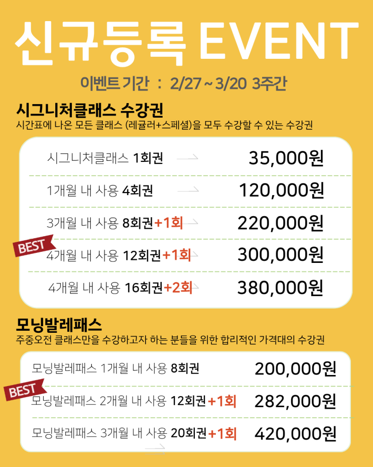 3월 시그니처클래스 신규등록 이벤트 따뜻한 봄, 발레를 시작하기 좋은 계절입니다 개강과 함께 신규 회원님들을 위한 특별 수강권 이벤트를 준비했습니다. 이번 이벤트 혜택은 ✨수강권 추가 증정✨ 입니다! 이벤트 혜택 -시그니처클래스 8회권 → +1회 추가 -시그니처클래스 12회권 → +1회 추가 -시그니처클래스 16회권 → +2회 추가 -모닝발레패스 12회권 → +1회 추가 -모닝발레패스 20회권 → +1회 추가 ️ 이벤트 기간 2026.2.27 ~ 3.20 (3주간) 대상 신규 회원 (2026.3.31 이내 수강권 개시 필수) 유의사항 -1인 1회 적용 (중복 불가) -3/20까지 결제 완료 건에 한해 적용 -3/31 이내 개시 필수 (미개시....... <img src="https://blogthumb.pstatic.net/MjAyNjAyMjhfMjM5/MDAxNzcyMjU1MTA1NzYw.VFC5sSagj-G2yV1Pf1VVq57Ar8n1zkG6cbeHP_tQcu8g.04NaAxipnpy5sCbXKEbeC0-ilYla7PINyN0D5iMjQswg.PNG/5.png?type=s3" />
