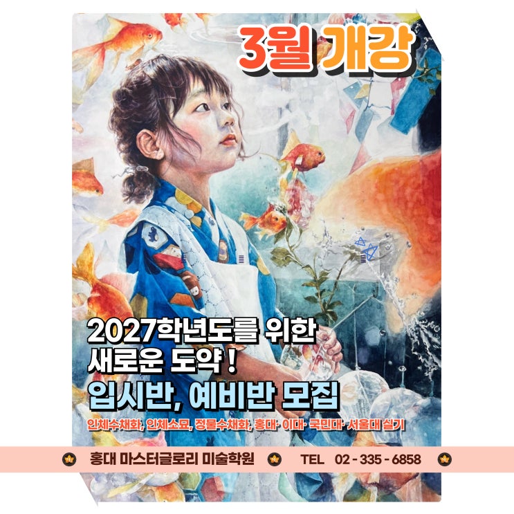 안녕하세요 여러분~ 홍대미술학원 마스터글로리 미술학원입니다! 다들 새롭게 시작한 3월도, 또 이번 한 주도, 힘차게 시작하고 계셨을까요? 벌써 둘째주가 시작되면서 설레는 마음과 걱정들, 그리고 본격적으로 바빠지는 삶들이 부딪히며 시간이 정말 빠르게 지나가는 듯 느껴지죠 ㅎㅎ 이제 현역이 된 친구들도, 재수를 결심한 친구들도 모두 그렇게 느낄 텐데요 입시를 준비하면 시간은 정말 빠르게 갑니다 하루는 너무 긴데, 지나고 보면 아쉽기만 한 날들이 많을 텐데요 고지가 앞에 있으니! 조금만 더 힘내서 하루하루를 후회없이 만들어봅시다 그래서 오늘 할 이야기는요! 이제 2027학년도 입시가 다가온 만큼, 저희 마스터글로리 미술학....... <img src="https://blogthumb.pstatic.net/MjAyNjAzMDlfNzYg/MDAxNzczMDYzMDgzNjc1.Q5ydWXAuF-gw35QkRezAtc8UA5QhV8Jy0AlKleEpJGwg.cKcuUZMqO-BJIjzx3mufiDzQksSkdNj0YsvKU3rI-oog.JPEG/%3F%A0%9C%EB%AA%A9%EC%9D%84-%3F%9E%85%3F%A0%A5%3F%95%B4%EC%A3%BC%EC%84%B8%3F%9A%94_-001_%283%29.jpg?type=s3" />