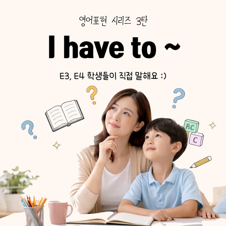 “I have to do my homework.” E3·E4 레벨에 들어서면 아이들의 영어는 감정 표현을 넘어 ‘상황 설명’으로 확장됩니다. 루체테어학원에 마포상암캠퍼스에서는 이 시기에 꼭 필요한 표현, I have to ~ 를 통해 아이들이 영어로 자신의 하루를 설명하는 연습을 합니다. E3·E4 아이들이 직접 쓰는 영어표현 I have to ~ 로 해야 할 일을 말해요 E3·E4 단계는 영어 표현이 조금 더 현실적으로 바뀌는 시기입니다. 놀이와 취향을 넘어서, 해야 할 일, 정해진 일을 영어로 말하기 시작해요. “I have to ~”는 학교생활과 일상을 가장 잘 담아낼 수 있는 표현입니다. ✔️ I have to do my homework. ✔️ I have to go to school. ✔️ I have....... <img src="https://blogthumb.pstatic.net/MjAyNjAyMDZfMjEz/MDAxNzcwMzYzMTYwODk5.mEwQtneTWYVSZbbqeBzeL6TuTLj5b6tRr2K5zJK7nMMg.fZfhW40AZYX622zrkwUCN3MdWBUY7G9uN_CoBnXoJlsg.JPEG/sss.jpg?type=s3" />