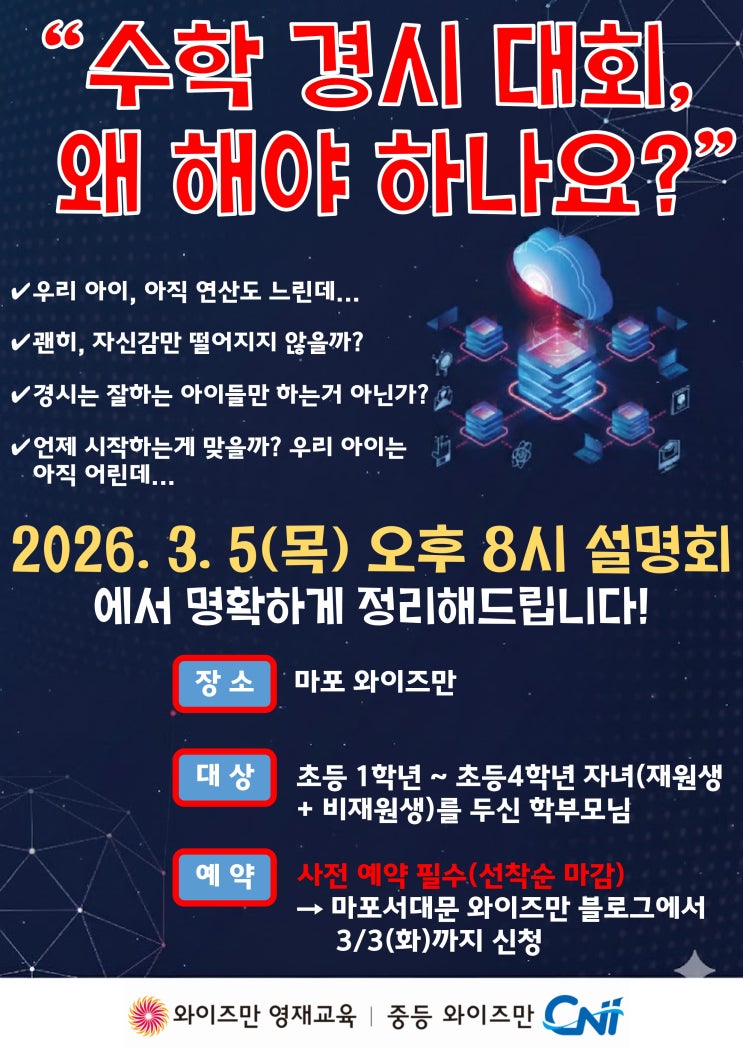 수학 경시대회, 왜 해야 하나요? 안녕하세요. 와이즈만 마포센터입니다. “우리 아이, 아직 연산도 느린데 괜히 자신감만 떨어지지 않을까요?” “경시는 잘하는 아이들만 하는 거 아닌가요?” “언제 시작하는 게 맞을까요? 아직 어린데…” 많은 학부모님들께서 수학 경시대회에 대해 비슷한 고민과 질문을 가지고 계십니다. 이번 설명회에서는 수학 경시대회를 왜 준비해야 하는지, 언제 시작하는 것이 좋은지, 어떠한 경시대회가 있고, 또 어떻게 접근해야 하는지를 명확하게 정리해드릴 예정입니다. 설명회 일정 안내 일시 : 2026년 3월 5일(목) 오후 8시 장소 : 마포 와이즈만 대상 : 초등 1학년 ~ 초등 4학년 자녀를 둔 학부모....... <img src="https://blogthumb.pstatic.net/MjAyNjAyMjVfMjg3/MDAxNzcyMDA2NTYwNzk5.nbcAkaYg7Dft4H5oBNjsi-Fu4VTXwc8bgf7Fn9SCTNUg.F06yMiPRsKp0pDuxCLAbpmp5ZxLTqoIif-B-6B3Jldsg.JPEG/%BC%B3%B8%ED%C8%B8_%C6%F7%BD%BA%C5%CD_page-0001.jpg?type=s3" />