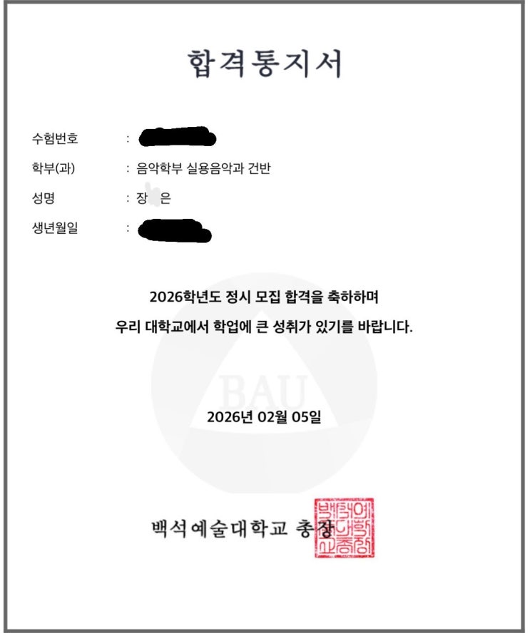 2026년도 백석예대 실용음악과 피아노 정시 합격 장O은 합격 후기