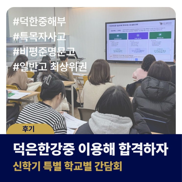 안녕하세요. 가디언어학원입니다 :) 지난 주 토요일에는 가재울중, 증산중에 이어 덕은한강중 예비중1-예비중3 학부모님들을 모시고 신학기 특별 간담회를 진행하였습니다. 고입 전반에 대한 이해를 바탕으로 덕은한강중의 평가 체계와 특별 프로그램들을 어떻게 활용해야 좋은 결과를 거둘 수 있을지 학부모님들께 직접 설명드리는 자리였습니다. 정말 도움이 되기를 바라는 마음으로 하루 종일 자료를 준비해서 뵌 만큼 학부모님들께서 좋은 후기를 남겨주셔서 정말 뿌듯했습니다. 덕은한강중 간담회 학부모님 후기 방문하신 학부모님들께는 두고 두고 참고하실 수 있는 풍성한 자료와 정성스럽게 준비한 다과를 제공해 드렸습니다. :) 진학 목....... <img src="https://blogthumb.pstatic.net/MjAyNjAyMTFfMjA1/MDAxNzcwNzY2NzgzNjcw.wEIOe15MaaK25YUaA6MGdIvJZB0xonSHx6nvrO0kUmog.czMRgyNnErGxIqp32ix9HubIQAnod0PNJ6Mt3P4z2zMg.JPEG/%C1%A6%B8%F1%C0%BB_%C0%D4%B7%C2%C7%D8%C1%D6%BC%BC%BF%E4._%281%29.jpg?type=s3" />