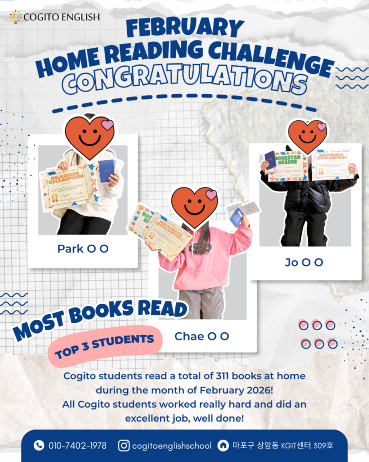 2월 홈리딩 챌린지 February Home Reading Challenge 안녕하세요 코기토 영어학원입니다. 코기토 영어학원에서는 지난 2월 한 달 동안 Home Reading Challenge를 진행했습니다. 아이들이 집에서도 영어책을 꾸준히 읽어보자는 취지로 진행한 작은 챌린지였습니다. 2월이 끝나고 아이들이 읽은 책을 하나씩 모아보니, 코기토 학생들이 집에서 읽은 영어책이 총 311권이었습니다. 하루에 한 권, 어떤 날은 몇 페이지씩만 읽었을 수도 있지만 그렇게 조금씩 이어온 독서가 모여 이렇게 많은 권수가 되었습니다. 이번 챌린지에서는 특히 가장 많은 책을 읽은 Top 3 학생들이 있었는데요, 꾸준히 책을 읽어온 모습이 참 인상적이었습니다. 정....... <img src="https://blogthumb.pstatic.net/MjAyNjAzMDhfOTcg/MDAxNzcyOTY4ODE0ODM4.46Yrl0x156Oo0tXvOzHK9KcsH_QJqf4_zh2K9BzZGQkg.b8kaemzWCRuhEONWfhDn2o9crHOKErioRGdnjkWRYlQg.PNG/900%A3%DF1772775962753.png?type=s3" />