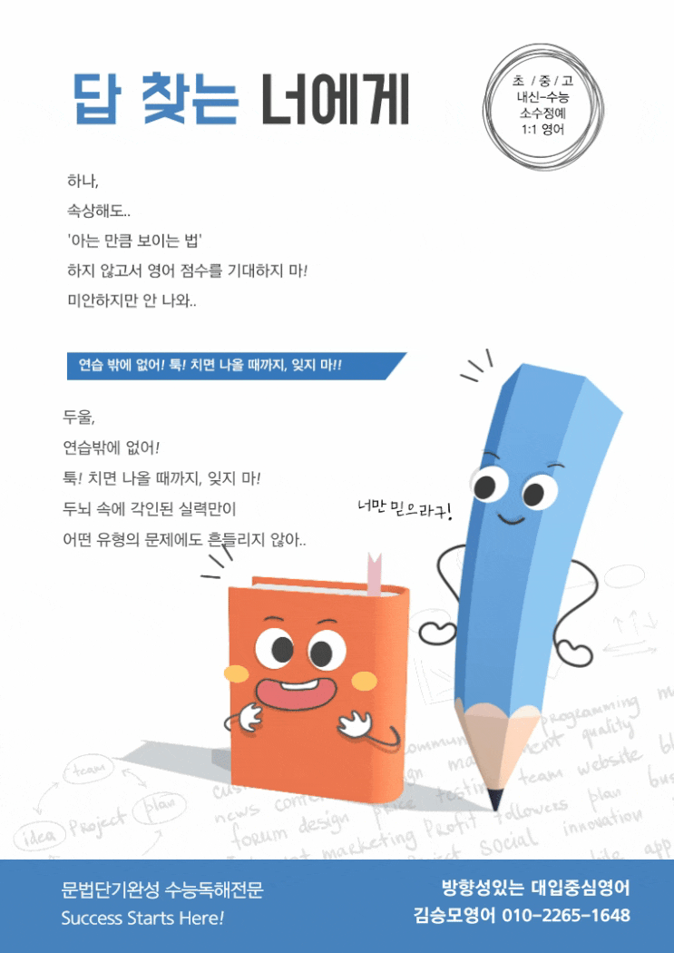 쌤쌤과 수업한 학생의 반복학습을 돕기 위해 강의음원과 교재를 올리는 거 알고 있죠? 사실, 쌤쌤의 블로그가 학생 한명한명의 복습과 예습을 돕기 위해 유지되고 있다고 봐도 무방할 거예요 ^_^ 반복이 없는 공부는 낭비일 뿐입니다. ___ ___이 없는 수업도 낭비일 뿐이죠! 맞죠? __ __ 에 어떤 단어가 들어갈까요? 아래 영어문장이 힌트입니다. Repeat these sentences. And make them yours! 정답: 복습 쌤쌤이 늘 강조하는 '반복'이라는 단어를 뒤집으면 '복습'입니다. 반복이 없는 공부는 낭비 복습이 없는 수업도 낭비 잊지마세요! 열분! <img src="https://blogthumb.pstatic.net/MjAyNjAzMTZfMjk2/MDAxNzczNjU5NTg0NDIx.Sx1RuaNZ80xkk_lH0d-Wqe1ouiJ_a08pWPisKCbH3r0g.GzNYnURD1VK8Er79HW9ojVilqzIXT7eLXNEx3N3m7pMg.GIF/%B1%E8%BD%C2%B8%F0%BF%B5%BE%EE-%C8%AB%BA%B8%C0%FC%B4%DC_%BE%E7%B8%E9_.gif?type=s3" />