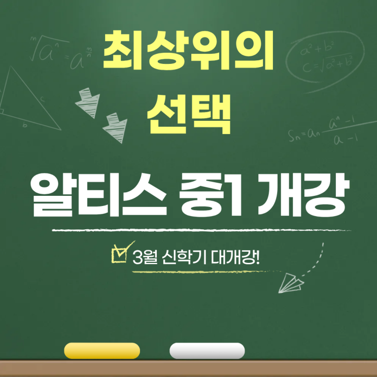 안녕하세요 신촌 알티스 수학학원에서 2026년 3월 중1 신규 개강을 알려드립니다 매년 그래왔듯 중1 도약심화반과 요일별 부스터반 모두 개강하였습니다 중1 월수금 도약심화반 저희 신촌 알티스 수학학원의 자랑이자 가장 많이 문의주셨던 ALTIS 중1 도약심화반이 개강합니다 매년 과학고 영재원 / 국제고 영재원에 합격하는 수업으로 신촌 알티스 수학학원의 간판이기도 합니다 3학기 이상의 선행이 되어 있는 학생들의 수강을 권장하며, 신촌 알티스 수학학원의 심화반 선배들의 대학 입결과 영재원 입결로 수준이 증명된 수업이기도 합니다 [2026년 고수반 대학 입결] https://blog.naver.com/altismath/224177422459 [2025년 도약심화반 영....... <img src="https://blogthumb.pstatic.net/MjAyNjAzMDFfMjk4/MDAxNzcyMzYxNTQ0MTEx.OewuYC5Mfs865o1hvUTmyyMTcSYAKd3aLswTF-W2d_8g.bQHKppBWXeYda_XXqewM_vDF_0w_uEI5YRF_YJ8wQ6cg.PNG/%B0%A3%C6%C7.png?type=s3" />