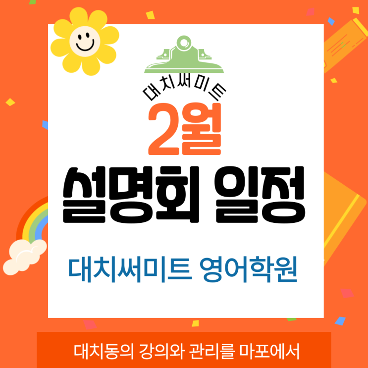 안녕하세요. 마포 입시 영어의 중심 대치써미트 영어학원입니다. 대치써미트 영어학원에서 새학년 새학기를 준비하는 친구들의 학부모님들을 위한 2월 설명회 일정 안내드립니다. 1) 2월 4일 수요일 오후 7시 30분 대치써미트 영어학원 제1관 202호에서 입시왕 하니쌤께서 <2022 교육과정과 대학입시전략> 설명회를 진행해주십니다. 2) <남고 영어 & 국어 내신 분석과 세특 설명회> 2월 7일 토요일 오후 2시 대치써미트 영어학원 제2관 301호 홍석영 영어 원장님 & 이윤림 국어 원장님 & 학교별 담당 선생님께서 광성고, 배문고, 숭문고, 용산고, 환일고 입학을 앞두고 있는 자녀를 두신 학부모님을 위한 영어 & 국....... <img src="https://blogthumb.pstatic.net/MjAyNjAxMTlfMTc2/MDAxNzY4Nzk2MDAxNzU0.69utlayYu8sEu5l2zKaDO8eRbfl2yNjq84gRipEAVogg.iHYbMoQ136CvFqfXW-5XkxWbFmm1xIgSau5eApjv3kYg.PNG/%BA%ED%B7%CE%B1%D7_%B4%EB%C7%A5.png?type=s3" />