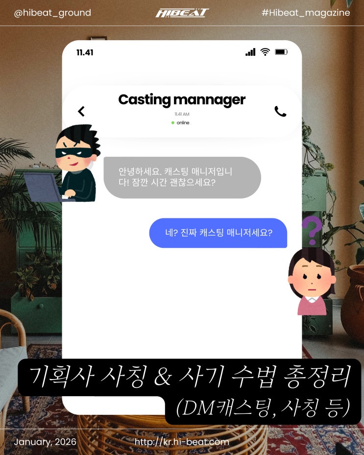 안녕하세요. 하이비트 매거진입니다. 최근 아이돌 지망생 사이에서 가장 많이 제보되고 있는 문제가 바로 기획사 사칭 DM 캐스팅 사기 입니다. 아이돌이라는 꿈과 간절함을 이용해 오디션, 캐스팅, 연습생 제안을 빌미로 접근하는 사칭·사기 사례가 실제로 계속 발생하고 있습니다. ♀️ 오늘 하이비트 매거진에서는 갈수록 교묘해지는 기획사 사칭 범죄 사례와 아이돌 지망생이 반드시 알아야 할 캐스팅 사기 유형을 정리해 드리고자 합니다. 또한 오디션 연결을 이유로 아이돌 지망생에게 금전을 요구하는 사례에 대해서도 함께 짚어보겠습니다. 아이돌 지망생을 노리는 대표적인 케이팝 기획사 사칭 범죄 아이돌 오디션 사기인가요? ....... <img src="https://blogthumb.pstatic.net/MjAyNjAxMjRfOTAg/MDAxNzY5MjM1NzIyNDE0.Rw23ADV-1809w2_fqEPArnA29ytXuwHFOhfSy1NDbBYg.BbA2a5wr1EUrzWWjvC6EOZmdM36iLDTVxq12csJKhnUg.JPEG/1.jpg?type=s3" />