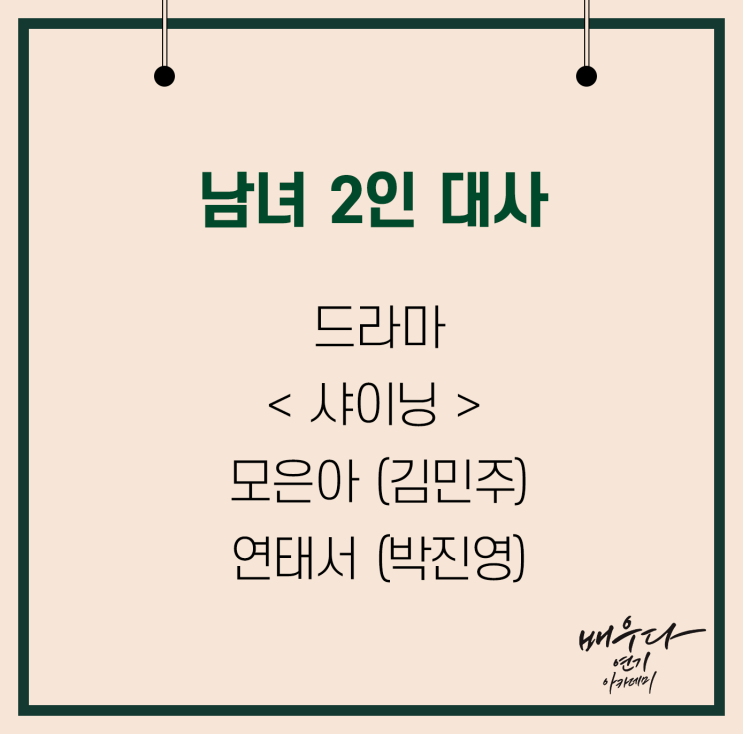 드라마 < 샤이닝 > 1화 모은아 (김민주), 연태서 (박진영) 남녀 2인 대사 모은아 : 뭐야, 확 달라졌잖아. 영영 안 볼 것처럼 굴더니. 연태서 : 아까는… 모은아 : 아까부터 아니고 여름 방학 이후 쭉. 쌩까고 대충 말도 막 얼… 연태서 : 쉿, 쉿. 모은아 : … 연태서 : 긴장이 풀렸거든, 오늘, 순식간에. 모은아 : 그 기분 알아. 순식간에, 그거. 어젯밤부터 연우리에서 멀어진다는 생각에 막 속도 안 좋고. 근데 아까 기차 안에서 너 보는 순간 불안이 싹 날아가더라, 순식간에. 희한해. 너 때문에 공부도 잘되고, 조금이지만 성적도 오르고, 용기도 내고. 넌 나한테 뭘까? 연태서 : ‘퍼실리테이트’ 네가 여름에 한숨 쉬면서 외우던 단....... <img src="https://blogthumb.pstatic.net/MjAyNjAzMTFfNzEg/MDAxNzczMTk5MDE3NDI3.4oS-8lc8iKN6Bh8dvf232LRgoX4VdrcKKydSofF6vDwg.iPziXw6YEkVsIxdn3o9jA04JqfPJTZYizgbu4nmIWXkg.PNG/%BB%FE1.png?type=s3" />
