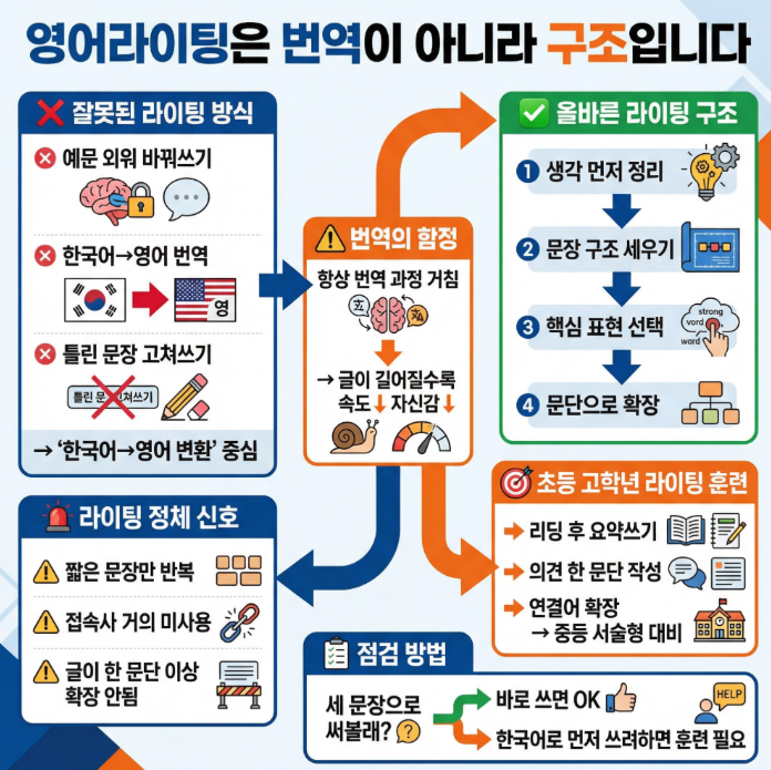 초등 영어라이팅을 배우면 아이들은 보통 이런 문장을 씁니다. “I like soccer. I play soccer with my friend. Soccer is fun.” 또는 한국어로 먼저 생각하면 이렇게 됩니다. “나는 축구를 좋아한다. 나는 친구와 축구를 한다. 그래서 축구는 재미있다.” 문장은 틀리지 않았지만 글이 자연스럽게 이어지지는 않습니다. 마포 상암 루체테어학원 마포상암캠퍼스에서는 그 이유를 단어 부족이 아니라 ‘번역 중심 글쓰기 습관’에서 찾고 있습니다. 초등 영어라이팅, 왜 문장은 맞는데 어색할까요? 초등 영어라이팅을 배우는 많은 아이들이 문법적으로 틀리지 않은 문장을 씁니다. 하지만 글 전체를 읽어보면 문장이 따로 놀거나 생각이 자연스....... <img src="https://blogthumb.pstatic.net/MjAyNjAzMTFfMjQ5/MDAxNzczMjA5NjM4OTI5.UsEemN66l107qTJChslc7mbcTivIxkXyY2LhJ_CEYpsg.gc_EqnaDt9X7d4KgLeDL7mgQ8526JRYaF2axOO2RAAwg.PNG/image.png?type=s3" />