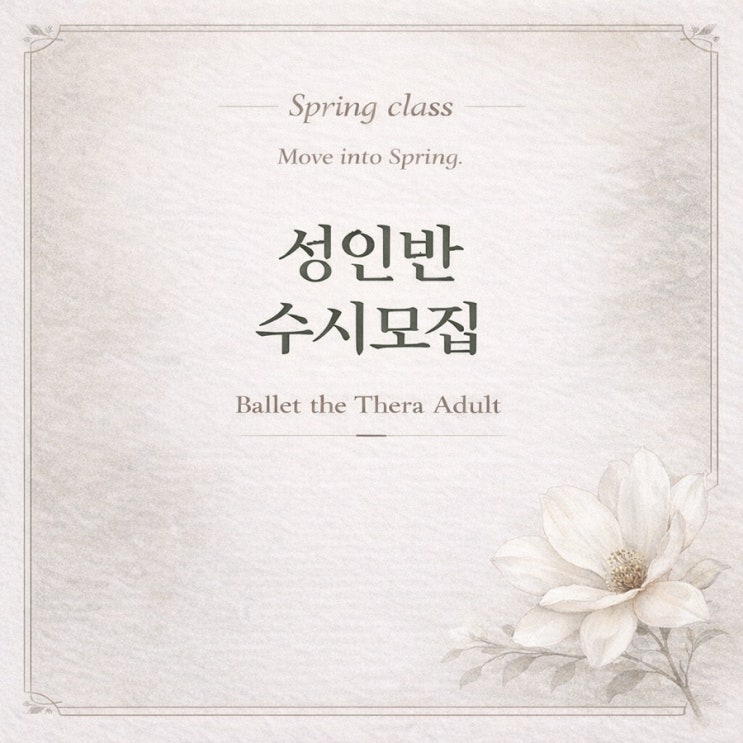 Ballet the Thera Spring Season 〈성인 클래스 모집〉 연한 바람이 스치는 계절, 몸의 정렬과 라인에도 새로운 숨이 들어옵니다. 발레더테라 성인 클래스는 러시아 바가노바 메소드(Vaganova Method) 를 기반으로 한 정통 클래식 발레 프로그램으로, 섬세한 정렬과 라인을 정돈하며 봄의 리듬 속에서 ‘나의 움직임’을 다시 세팅합니다. ⸻ 발레더테라 성인반만의 차별점 1️⃣ 레벨별 맞춤 클래스 • 입문 / 기초 / 중급 / 상급으로 세분화 • 개인의 체력·유연성·목표에 따른 동작 조정 2️⃣ 아로마테라피 발레 융합 수업 • 시즌 아로마 오일 & 호흡 테크닉 결합 • 근육 이완, 림프 순환, 스트레스 완화 효과 3️⃣ 다양한....... <img src="https://blogthumb.pstatic.net/MjAyNjAxMDdfMTUg/MDAxNzY3NzkwNzgwMDg5.Pt8TvPeskgUT45RnZ_mbYkWhznCbwx6zlBaqyTCS7AUg.WEI6HBVgud5z3TjVQMDR76pvRxaRh3KLATt3S6xlZ5Qg.JPEG/71A66AA9%A3%AD103D%A3%AD4B19%A3%AD959E%A3%AD80A55FE1629D.jpg?type=s3" />