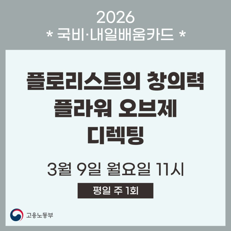 [ 국비 지원 과정 / 내일 배움 카드 ] 안녕하세요! 서울 신촌 지오지오 플로리스트 학원입니다. 2025년 개강 회차가 가장 많았던 인기 훈련 과목 중 하나인 플라워 오브제 디렉팅 과정을 개강합니다. 많은 학생분들이 디렉팅 과정이 더 길었으면 좋겠다는 의견을 수렴하여 ' 플라워 오브제 디렉팅 ' 과정과 ' 플라워 미디어 아트워크 ' 과정 두 가지로 나눠서 더 심도 있게 배우실 수 있는 커리큘럼으로 구성했습니다. 해당 수업은 내일배움카드를 이용하여 재직자, 구직자, 실업자, 국취제 1유형, 국취제 2유형 모두가 신청 가능한 과정입니다. 내일 배움 카드 발급이 불가하신 분들은 자비부담 100%로 신청이 가능합니다. ....... <img src="https://blogthumb.pstatic.net/MjAyNjAxMDhfMjMy/MDAxNzY3ODY3OTI5ODcw.7diXeaG5IHccBAhRMz80kGjiCVCvUCwHyoJ8uDxbAjsg.XVEQjBPkQ6bqVP7bqYpUxU-cpKl2KZxGSVz70CC19FQg.JPEG/0154579456.jpg?type=s3" />
