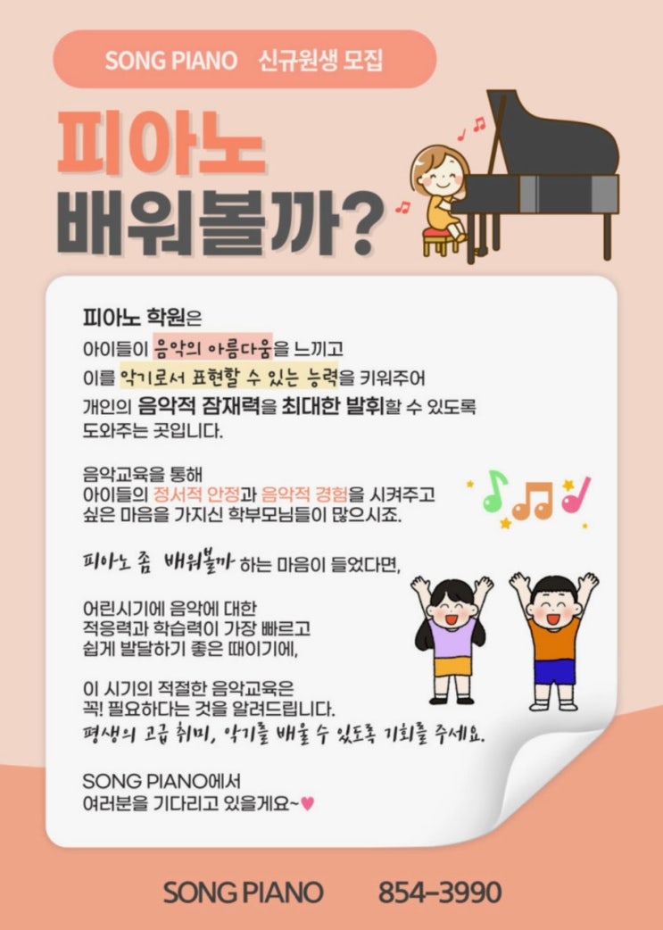 #충주피아노학원 #충주피아노 #충주피아노레슨 #충주음악학원 #충주용산동피아노학원 초등부 피아노 신입생 모집합니다 안녕하세요:) 송피아노음악학원입니다. 초등학생 시기는 피아노 실력뿐 아니라 집중력, 표현력, 자신감이 함께 자라는 중요한 시기라고 생각합니다. 아이들이 음악을 부담이 아닌 즐거운 경험으로 오래 이어갈 수 있도록 지도하고 있습니다. ✔ 사범대 음악교육과 출신 원장 직강 ✔ 아이 성향과 수준에 맞춘 1:1 맞춤 수업 ✔ 진급 시 학부모 상담 진행 ✔ 매월 특강 수업 (예술융합, 연주특강 등) ✔ 정기 콩쿨 참여 기회 제공 아이들이 무대 경험을 통해 성취감과 자신감을 키울 수 있도록 돕고 있습니다 :) 현....... <img src="https://blogthumb.pstatic.net/MjAyNjAzMDVfMTA5/MDAxNzcyNjU5NDQyMjIx.qFrTEdDgEsvXDjiooOHD-Nva8eNFLmUO0MJGj6RhtgAg.IH3Iy3NcQXY3WbxxbxC2aBlu2_2-XpXFFrCleQ4GGqog.JPEG/IMG%A3%DF4145.jpg?type=s3" />