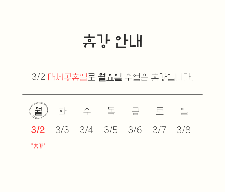 안녕하세요 수펙트럼수학 대치동 레몬쌤입니다 3월 휴강일 재안내 공지입니다 학원에서 이미 안내드렸지만 블로그에도 수업 공지 올립니다 삼일절 대체공휴일로 3/2 수업은 휴강입니다 새 학기 준비 마치고 3/3 수업에서 만나요!! 수학 스펙트럼의 확장! 수펙트럼수학입니다 <img src="https://blogthumb.pstatic.net/MjAyNjAzMDFfNTkg/MDAxNzcyMzcyMjQ0ODI0.i1locvIJny90OnF9wVFrBbbdJkwHnyonAjtKF7GSljIg.HxltCJD1Zc_ZDPgLinPQb5Q9EhYFdi4W4zF42MBQQz4g.PNG/%C8%DE%B9%AB_%BE%C8%B3%BB.png?type=s3" />