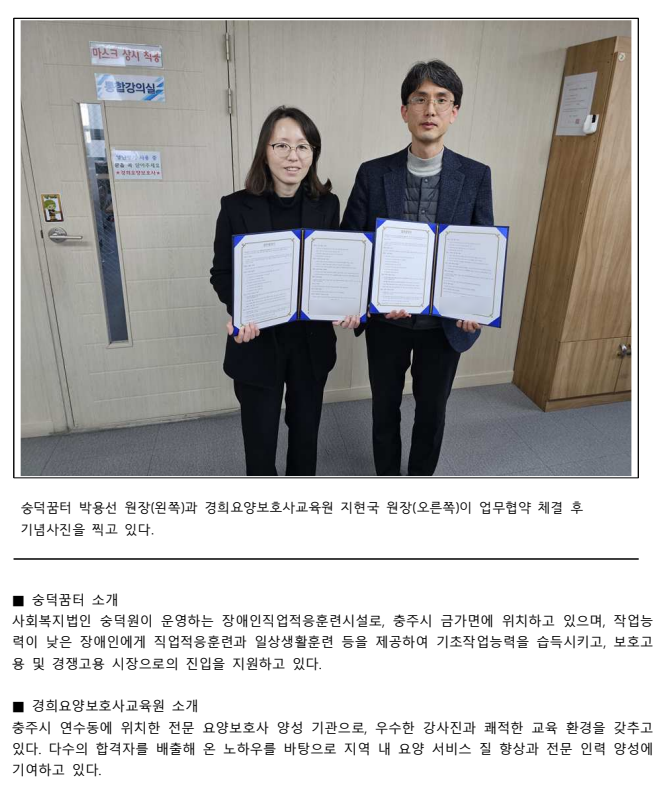 발달장애인 요양보호사 양성 업무협약 체결 - 숭덕꿈터와 경희요양보호사교육원 보도자료