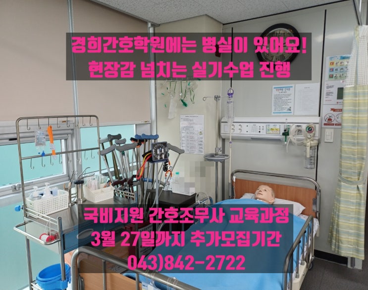 간호학원에 병실이 있다면 믿으시겠어요? 경희간호학원에는 있답니다. 현장감 넘치다 못해 병원에서 수업받는 느낌 현장이 이론속으로 쏙~~~ 낯설지 않은 분위기 속에서 수업 진행 그래서 취업 연계가 아주 잘 이루어지고 있는 경희간호학원 간호조무사 국가고시 합격은 당연 취업까지 고민이라면 경희간호학원에서 시작하세요. 실력의 차별화 충주 최초 국비지원 간호조무사 교육과정 운영 경희간호학원 보건복지부 지정교육기관 고용노동부 직업훈련기관 중 우수훈련기관 전국에서 실력 상위 경희간호학원 등록문의 043)842-2722 국민내일배움카드 소지자에 한하여 3월 27일까지 등록 가능합니다. 평일 오전 9시부터 오후 7시까지 토요일 오전....... <img src="https://blogthumb.pstatic.net/MjAyNjAzMDlfMTkx/MDAxNzczMDM4NTI1MzE3.blSVflAYEG-xtEZ62Yd63VYQ5HqiJZll5i24VEHNbEgg.rB3XP_KWjIZVBiW8XZuoqm8FI9BfjVS_OIrO8mLAUl4g.JPEG/KakaoTalk_20260309_151146988_02.jpg?type=s3" />