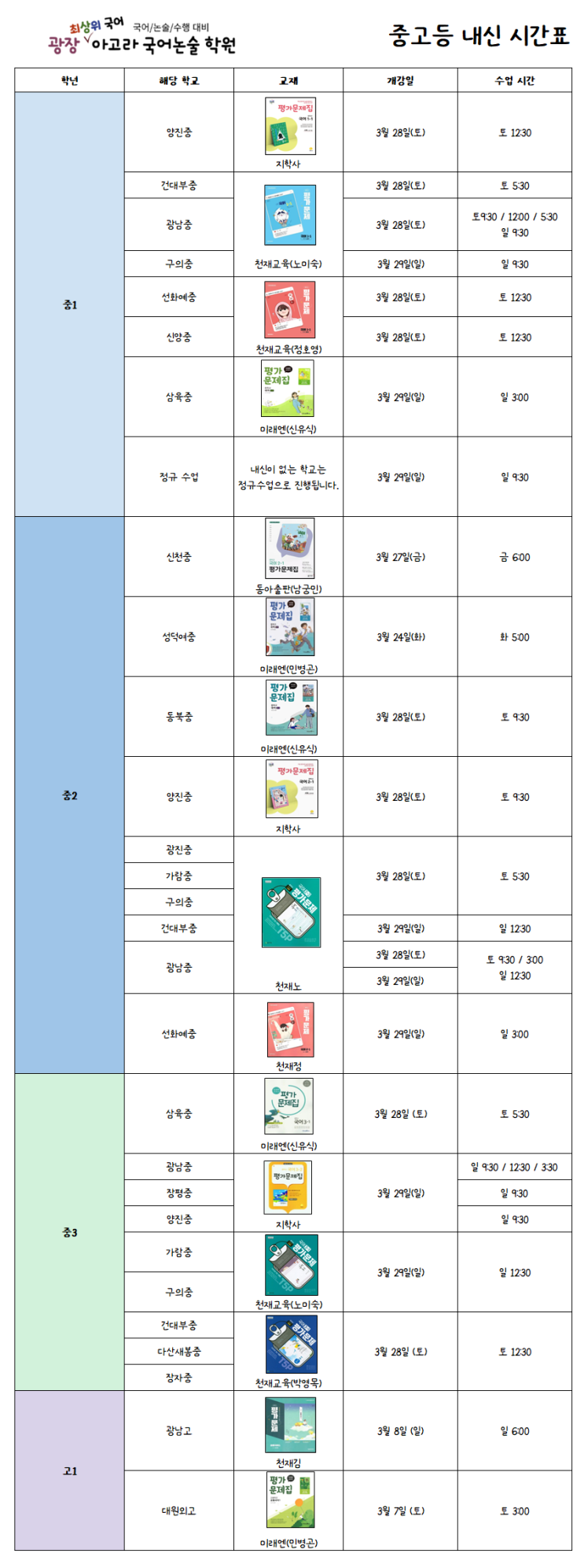 [중등 내신-1학기 중간고사 시간표 안내] 아고라 국어논술