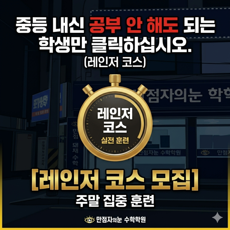 [운에 기대지 않는 절대 실력, 만점자의 눈] 중등 내신 기간, 남들 기출 문제 뺑뺑이 돌리며 제자리걸음 할 때, 누군가는 고등 수학의 **'절대 실력'**을 완성합니다. 더 앞서가자, 그리고 멈추지 말자 진도를 나가는 곳은 많지만, 시험장에서 점수를 뽑아내게 만드는 곳은 드뭅니다. 단대부고 출신 수능 수학 만점자가 직접 설계한 지독한 실전 훈련 시스템, [레인저 코스] 모집을 시작합니다. 레인저 코스는 이런 분들을 위한 '특수 훈련'입니다. 중등 내신은 이미 완성되어 더 이상의 반복이 무의미한 학생 내신 기간에도 고등 수학의 '킬러 문항' 감각을 유지하고 싶은 학생 내 실력이 고등학교 내신에서....... <img src="https://blogthumb.pstatic.net/MjAyNjAzMTZfOSAg/MDAxNzczNjY5NTg5MDIz.Kj-NS7OSJwsjZwItfRQGPWeK1-LdECa01JfEkNgwNtcg.bAFxnhD0px00sUPVg5lHQSLaVpJpRWTTfeIYtM-Q8gYg.PNG/Gemini_Generated_Image_7vkj857vkj857vkj.png?type=s3" />