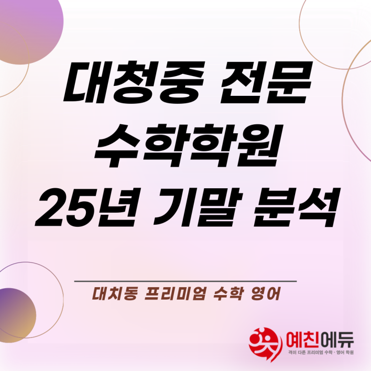 " 대청중 수학학원 2025년 3학년 2학기 기말분석 박경원T " 안녕하세요, 대치동 은마상가 영어 수학학원 예친에듀입니다. 중학교 3학년 수학 시험은 단순한 내신 평가를 넘어, 고등학교 수학 학습을 준비하는 중요한 기준이 되기도 합니다. 특히 2학기 시험은 여러 단원의 개념을 종합적으로 활용하는 문제가 등장하기 때문에 학생들이 개념을 얼마나 정확하게 이해하고 있는지가 그대로 드러나는 경우가 많습니다. 이번 글에서는 2025년 대청중 3학년 2학기 수학 기말고사 기출을 통해 시험 문제를 단순히 풀어보는 것을 넘어서, 대청중 시험이 어떤 사고 과정과 학습 준비를 요구했는지를 살펴보려고 합니다. " 대청중 시험 흐....... <img src="https://blogthumb.pstatic.net/MjAyNjAzMDlfMjcw/MDAxNzczMDAxMzAyNDU1.OOWup2nLn5SPkzRlwxnKUWUM6kDllDw-QNishWqubKEg.wLbpe4YCn5vjwsmm-d6u7Z90nWTx1qbkPoqIdzDp3Dgg.PNG/%BA%ED%B7%CE%B1%D7-003_%2812%29.png?type=s3" />