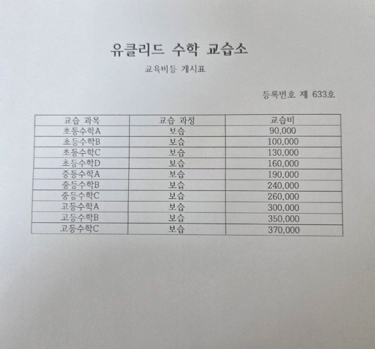 교습비등 게시표