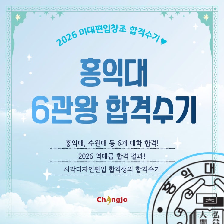 안녕하세요! 미대편입창조 홍대캠퍼스 입니다! 오늘도 따끈따끈한 합격생의 합격수기를 가지고 왔습니다! 오늘 주인공은 무려 6관왕!! 합격생이라는데요! 총 6개의 대학에 합격한 엄청난 학생의 합격수기를 함께 살펴볼까요? 2026년 미대편입 홍익대(조치원) 등 6관왕! 지OO 학생의 합격수기 공개!! ❓Q1. 미대편입 결심한 이유 (지원동기) 저는 전적대를 다니면서 학업에 크게 열정을 보이지 않는 사람들을 보며 편입을 결심하게 되었습니다. 물론 열심히 하는 학생들도 있었지만, 노력하는 사람과 그렇지 않은 사람의 차이가 크게 느껴졌습니다. 더 높은 목표를 가진 환경에서라면 저 역시 열심히 할 수 있겠다고 생각했고, 그래서 편....... <img src="https://blogthumb.pstatic.net/MjAyNjAzMTVfMTUx/MDAxNzczNTQ4MTAwNzEy.3A73X5JLfKUtEc4r_DSFkVQ3pLieNYpPuWWCaWwvW4Ag.9H9hlki34AK6u4gry-88pFXK-VTYqVp0JweqlQ6IENEg.JPEG/2026-%BA%ED%B7%CE%B1%D7-%BE%F7%B7%CE%B5%E5%BF%EB-%C7%D5%B0%DD%BC%F6%B1%E2_%BA%B9%BB%E7%BA%BB-003.jpg?type=s3" />