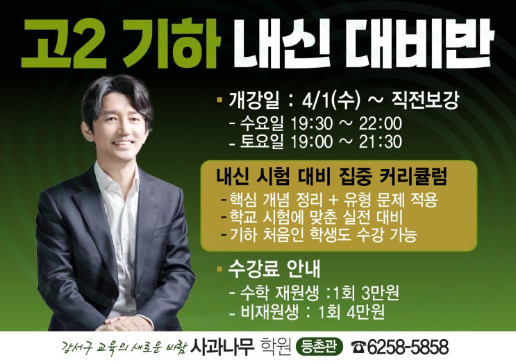 안녕하세요. 강서구 교육의 새로운 바람 [사과나무학원 등촌관] 입니다. 고2 기하 내신, 지금부터가 진짜 승부입니다. 고등학교 2학년, 수학에서 ‘기하’는 많은 학생들이 부담을 느끼는 과목입니다. 개념은 낯설고, 문제는 어렵고, 학교마다 출제 스타일도 달라 혼자 준비하기엔 쉽지 않은 단원이죠. 그래서 준비했습니다. 고2 기하 내신 대비 집중반 수업 안내 개강일 : 4/1(수) ~ 직전 보강 수업 시간 수요일 19:30 ~ 22:00 토요일 19:00 ~ 21:30 주 2회, 시험 대비에 최적화된 커리큘럼 내신 시험 대비 집중 커리큘럼 ✔ 핵심 개념 완벽 정리 → 기하의 기본 개념부터 확실하게 잡습니다. ✔ 유형 문제 집중....... <img src="https://blogthumb.pstatic.net/MjAyNjAzMjJfMTI2/MDAxNzc0MTQ2OTUwNjAx.YDU4tyemHy8445LqP1A2mP6VBiE0g7T0b5cxTUKI2Hgg._5S6eOW4MWEMuMvpDspc00Kk4vrtLzTVFVaetl1X7Lgg.JPEG/3.20-%B0%ED2_%B1%E2%C7%CF%B3%BB%BD%C5%B4%EB%BA%F1-01.jpg?type=s3" />