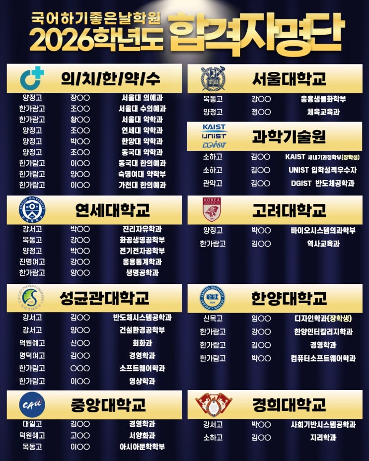 안녕하세요. 목동 국어학원 국어하기좋은날입니다. 2026학년도 대입 결과가 발표되면서 국어하기좋은날에서도 서울대, 연세대, 고려대를 비롯하여 KAIST·UNIST·DGIST 등 과학기술원과 의치한약수 계열 등 다양한 대학의 합격 소식이 이어졌습니다. 목동에서 내신과 수능 국어를 함께 준비하는 목동 국어학원으로서 2026학년도 대입 합격자 명단을 공유드립니다. 국어는 단순히 한 과목이 아니라 내신·수능·논술 모든 입시에 영향을 주는 핵심 과목입니다. 그래서 국어하기좋은날은 "성적이 오르는 국어 공부 방식"을 학생들에게 꾸준히 훈련시키고 있습니다. [국어하기좋은날 8단계 밀착 관리 시스템] 국어하기좋은날은 단순한 수업이....... <img src="https://blogthumb.pstatic.net/MjAyNjAzMDZfMzYg/MDAxNzcyNzc3NzgwODAy.myO4i-j1vb4T8mYy4G3Dlxi69ZRKSnKMLrXipY2TJ7Mg.cNvqhSvvvUuis7Szwb0a2MAYot225LvCpH7rt1yUGuEg.JPEG/%B1%B9%BE%EE%C7%CF%B1%E2%C1%C1%C0%BA%B3%AF_26%C7%D0%B3%E2%B5%B5_%B4%EB%C0%D4%B0%E1%B0%FA_%281%29.jpg?type=s3" />