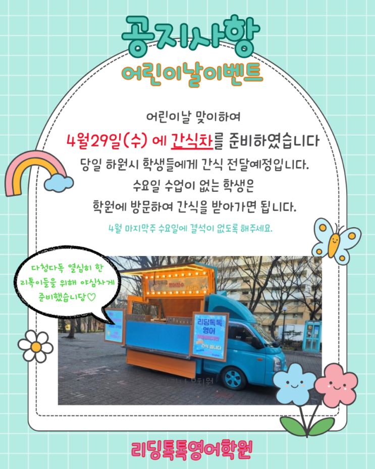 5월 가정의 달을 맞아, 리딩톡톡영어에서 재원생들을 위한 간식차 이벤트를 준비하였습니다. 리딩톡톡영어 원장이 재원생들에게 쏩니다! (간식 먹으러 오세요 ~) ⏰️ 언제? 4월29일(수) 수업후 간식 메뉴 ? 당일 공개 간식 2개를 받고 싶다면, 4월24일(금)까지 어버이날에 드릴 <부모님께 드리는 감사편지>를 써온 재원생들은 2종류의 간식을 받아갈 수 있답니다. (영어로 써온다면 더 특별한 것을 기대하세요) 4월 29일(수)에는 결석하지 않도록 합시다~~ <img src="https://blogthumb.pstatic.net/MjAyNjA0MjBfMTgw/MDAxNzc2Njg3MzkwMzI0.7D0AZqt2fKXn13Pptu72vYOVRFutDYySLFfRi832A3cg.kK21otu4aUHKEVSITgo8ED3WNWmu0A69OS83Sqx-Qr0g.PNG/900_1776685504842.png?type=s3" />