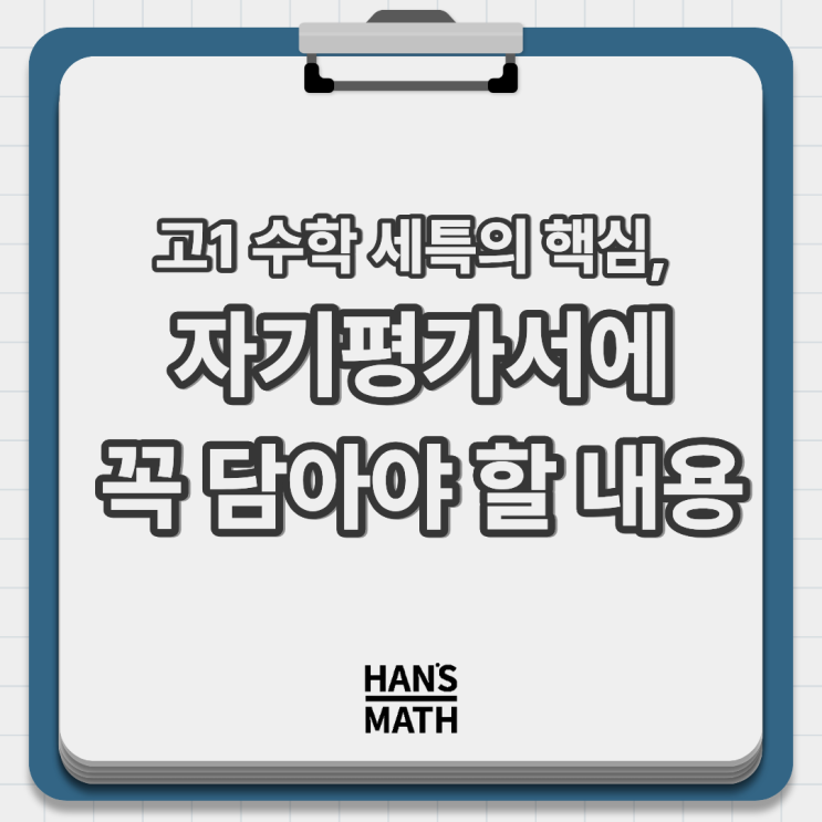 안녕하세요, 언제나 정성을 다하는 30년 수학교육 전문 한기주 수학학원입니다. 고등학교는 시험 점수만으로 끝나지 않습니다.특히 고1 첫 중간고사 이후, 점수보다 더 중요한 것은 바로 수행평가와 연계된 ‘세특(세부능력 및 특기사항)’ 관리입니다. 오늘은 대입의 핵심으로 떠오른 세특을 어떻게 전략적으로 준비해야 하는지, 그리고 그 과정에서 수학적 역량이 왜 중요한지 말씀드리겠습니다. [1] 선생님의 관찰을 돕는 ‘자기평가서’, 선택이 아닌 필수입니다 학생부 기재 방식이 바뀐 이후, 세특은 선생님의 ‘관찰’ 중심으로 작성됩니다. 하지만 한 분의 선생님이 모든 학생을 깊이 있게 기록하기에는 현실적인 한계가 있습니다. 이때....... <img src="https://blogthumb.pstatic.net/MjAyNjA0MjRfMjg3/MDAxNzc3MDE5NDQ3MTI2.GqX6A49jv3uIkr4nlFjsHOlz2N0KuvFGF_ikBnb8Bv4g.TVIcXagLmV5j6sAxQ0-xE9_cL1hHRym9wW6OOAFvs6cg.PNG/1.png?type=s3" />