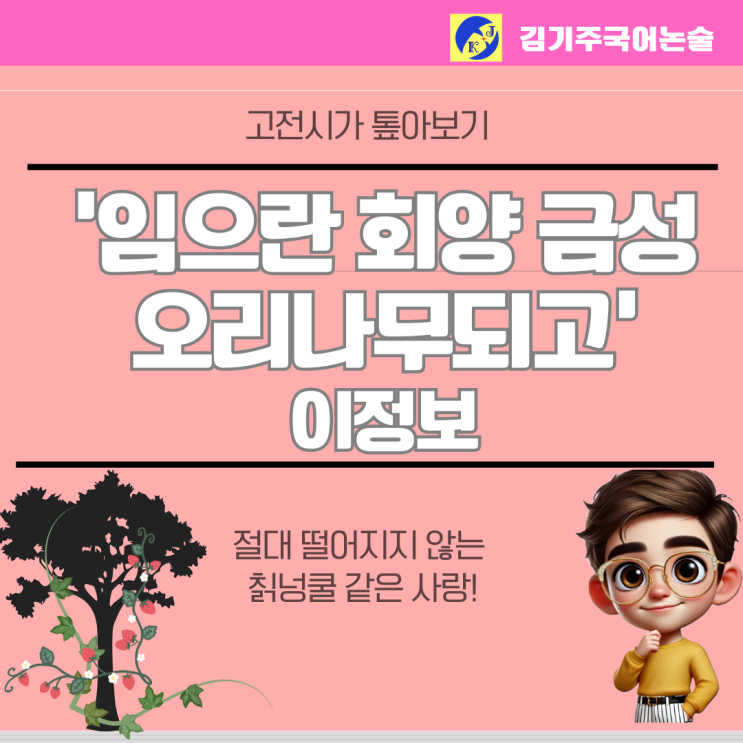 안녕하세요, 김기주 국어 주클래스입니다! 오늘 우리가 함께 들여다볼 작품은 2027 수능특강에 수록된 이정보의 사설시조 「임으란 회양 금성 오리나무 되고~」입니다. 임과 내가 각각 나무와 덩굴이 되어 서로를 칭칭 감아 안는다는 기발하고도 절실한 상상이 돋보이는 작품이죠. 사설시조 특유의 수다스러우면서도 진솔한 매력 속으로 함께 들어가 볼까요? 1. 감상의 길잡이 이 작품은 임에 대한 사랑을 오래도록 간직하고자 하는 화자의 굳은 다짐을 노래하고 있습니다. 현실에서는 불가능한 '변신'의 상상을 통해, 임은 '오리나무'가 되고 나는 '칡넝쿨'이 되어 그 어떤 시련이 닥쳐도 결코 헤어지지 않겠다는....... <img src="https://blogthumb.pstatic.net/MjAyNjA0MjRfOTMg/MDAxNzc2OTg4MjYxMjg3.AeaSJUkFwiTfyCHH6sZZ4mlFCJ-1QANGIN11g0lQoRkg.ZOLI1TUQhfgA1YLj77mWeKFsdvheB1lWk7CopxT7-48g.PNG/%C6%C4%B6%F5%BB%F6%B0%FA_%C8%B8%BB%F6_%BD%C9%C7%C3%C7%CF%B0%ED_%B1%F2%B2%FB%C7%D1_%BA%F1%C1%EE%B4%CF%BD%BA_%C4%AB%B5%E5%B4%BA%BD%BA_%C0%DB%BC%BA_%BF%E4%B7%C9_%BE%C8%B3%BB_%B5%F0%C0%DA%C0%CE_%C5%DB%C7%C3%B8%B4_%C0%CE%BD%BA%C5%B8%B1%D7%B7%A5_%C6%F7%BD%BA%C6%AE_%2815%29.png?type=s3" />